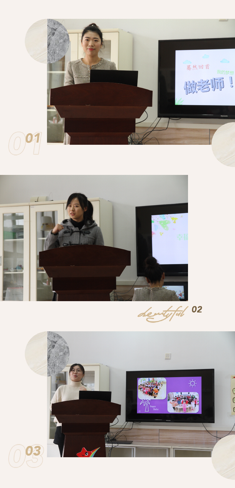 教育的海洋,我带着梦想起航、不忘来路不改初心、静待花开,做他们的守护天使、爱是根基——让我们的付出枝繁叶茂、用心对待,让喜欢变成爱……一篇篇主题鲜明、内容真切的演讲稿,展现出了新教师对于职业和梦想的思考。在演讲过程中,学员们不但吐字清晰、声音响亮,还非常具有表现力,通过动作、表情声情并茂地展现出年轻老师的青春洋溢:来自泗塘五村幼儿园的见习教师她的演讲主题是《爱的陪伴,成就梦的远航》,情真意切地从“幸福是什么?”、“教育梦想的铸立”、“微光前行”三个方面向在座的老师娓娓道来自己在教育路上的所思所行,十分动情,红星幼儿园的见习教师她的一篇《换个角度看一看——我的教育梦想之儿童观的转变》,从不一样的角度切入主题:换个角度让我们眼中的世界更多元,也让职初教师对教育这件事有了前所未有的认识。“换个角度”是教育观、儿童观的转变,变管教为教育者对幼儿的激发和鼓舞。呼玛二幼的老师用三句话开启了自己的演讲:“如果说教育是一种自我挑战,那么它需要我去勇敢面对;如果说教育是一种心灵碰撞,那么它需要我去真诚的对待;如果说教育是一种美好梦想,那么它需要我去毕生的追求。老师们用自己的行动来践行,学着用“爱”把孩子放入心里,用“爱”把孩子融入生活,用“爱”去充分了解和观察孩子。令人动容的是,有的老师带病上场,发着高烧坚持完成了自己的比赛任务;还有一些非专业毕业的老师,能利用自己的特长,思考如何作用于自己的教育实践……