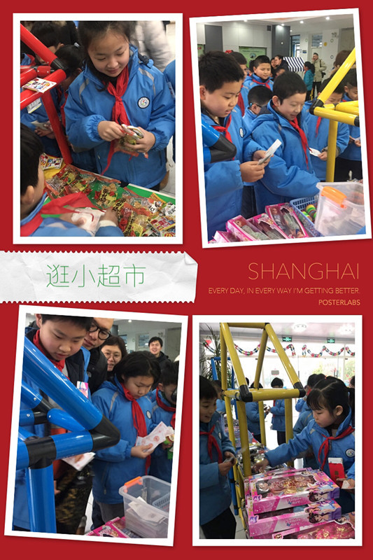 教学楼的门厅里,今天也变了模样,漂亮的货柜架上摆满了各种商品,有学习用品、小玩具、漂亮的芭比娃娃,还有一些小零食,同学们可以用他们积攒的小街鼓励金来换购。