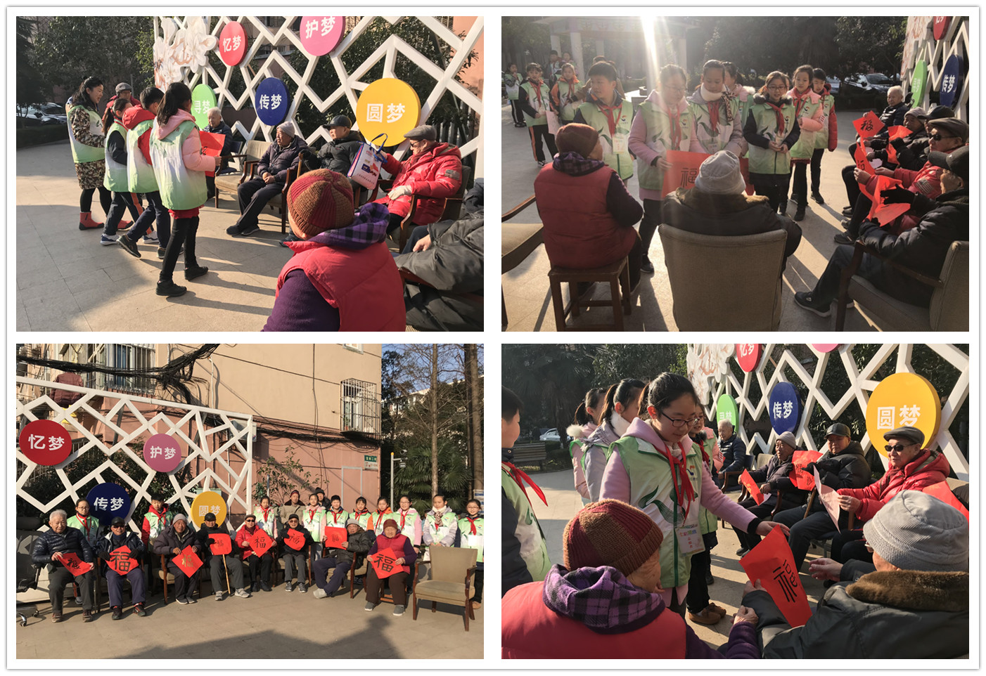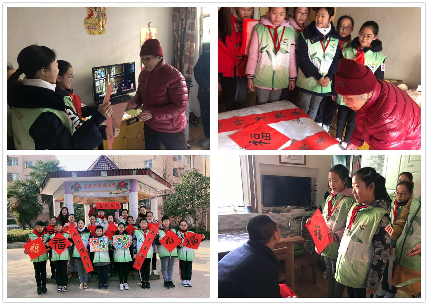 喜迎新春,写春联、贴福字是春节的传统习俗,也寄托着人们对新年最美好的祝福。为积极鼓励、引导少先队员体验民俗,感受民俗,学校组织四五年级各中队的书法小能手撰写新春“福”字,在社区居委干部的指引下,雏鹰假日小队的队员们来到了居民较为集中的社区戏曲角,老人们正在暖洋洋的晒着太阳,队员们纷纷上前,在送“福”字的同时也把新春最美好的祝福送给了爷爷奶奶们。随后,队员们来到了社区里两户较为特殊的家庭,把这份温暖亲手送给他们,参与活动的队员们纷纷表示今后要将敬老、爱老、关爱特殊人群的爱心接力棒传递下去,将这份温情源远流长。