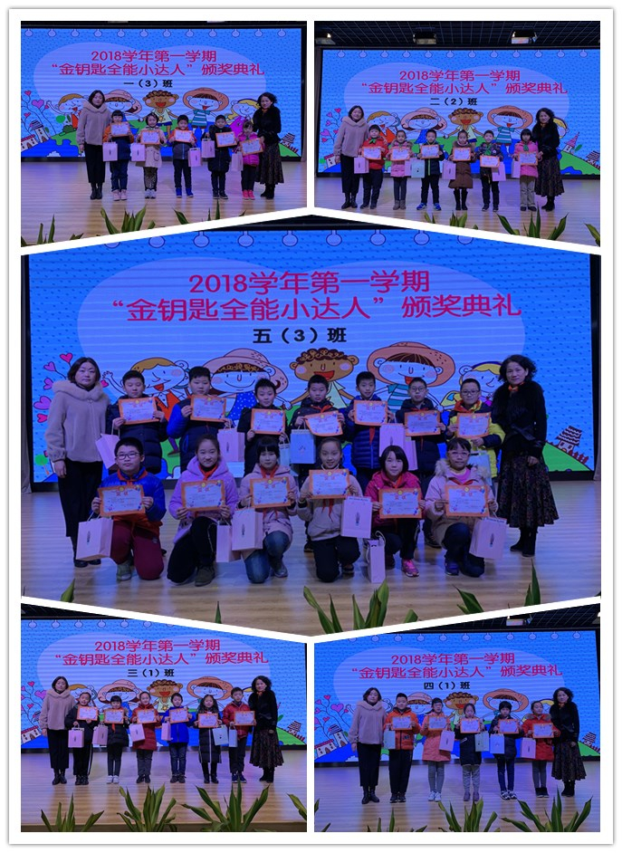 ;激发活力的金钥匙——爱艺术、敢创新、强体魄,孩子们经过一学期的努力,硕果累累,赢得了“金钥匙活力奖”、“金钥匙智慧奖”和“金钥匙魅力奖”。全校共有100名学生获得了“金钥匙全能小达人”的称号,其余的学生也根据自己累积的奖章获得了二等奖、三等奖的奖项和奖品。