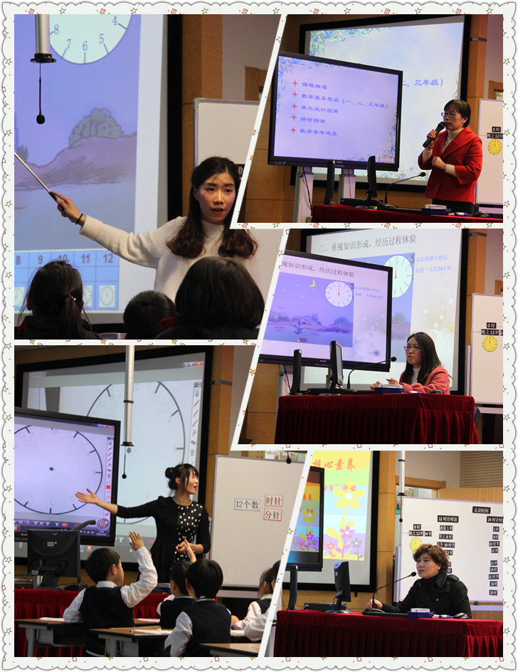 本次活动先由两位青年老师上了实践课。第一节课由大华小学的潘老师执教一年级《时间的初步认识》第一课时。第二节课由罗店中心校的施老师执教《时间的初步认识》第二课时。课中,两位老师充分利用课件创设情境,让学生在动态过程中感知时间的变化,同时也非常注重学生的课堂表达,培养了演绎、归纳等能力,体现了数学思维的发展。随后,大华小学的俞老师以《关注学生实际,培养核心素养》为主题对第一节课作了全面的评析。罗店中心校的张老师以《激活生活经验,感知计时方法,经历过程体验》为主题对第二节课作了针对性的点评。