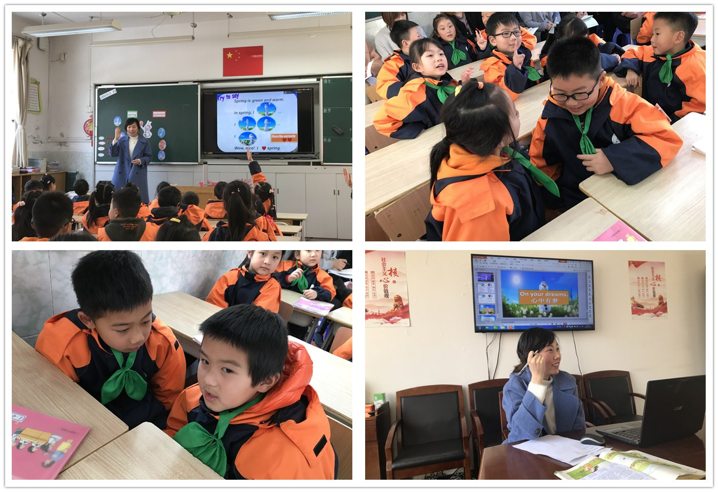 活动开始,陈老师进行了一年级的课堂教学实践,通过主人公Olaf,将学生带入有趣的情景中,引入对春天和夏天的认识。整节课在歌曲、儿歌等有旋律的节奏中,聆听、跟读、模仿等,操练所学,并尝试分享。