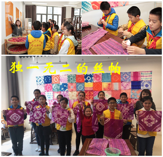 在染织体验馆,小记者们跟着嵇老师走进神奇的“丝绸之路”,聆听关于丝绸的故事,随后开始了折、扎、染、洗、熨的扎染之旅,大家都为自己扎染出独一无二的丝帕而雀跃。