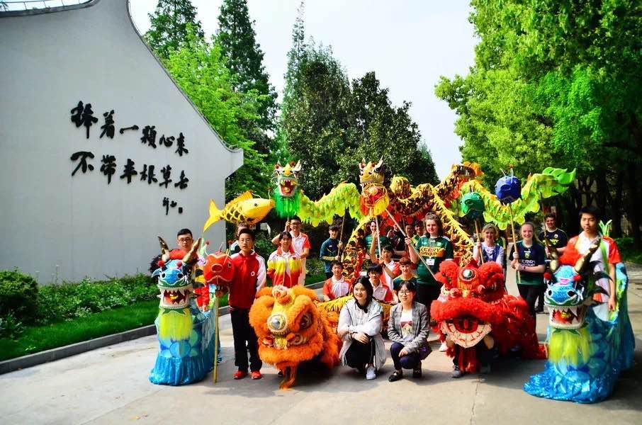 一见面,他们用字正腔圆的“你好”带来了来自西欧的问候,而我校龙狮队员则舞起龙狮、摇摆龙舟、举起龙鱼来表达我们的热情欢迎之意。在欣赏了一小段龙狮表演之后,爱尔兰学生早就跃跃欲试了,他们迫不及待地从龙狮队员手中接过金龙,捧过狮头,在龙狮队员的带领下摆起龙舞起狮。尽情体验过后,爱尔兰师生们和龙狮队员们一起留下了珍贵的合影,看到了中国江南特色的四合院、亭台楼宇非常欣喜,校园里的回廊下、小桥上也都留下了爱尔兰学生快乐的身影。在我校学生志愿者的热情指引下,爱尔兰学生来到行知育才旧院,体验了一把敲响铜钟的乐趣。在行知育才旧院门口稍事休息的时候,突然响起了踢踏舞的欢快乐曲声,接着爱尔兰学生跳起了铿锵有力的踢踏舞,原来这是爱尔兰学生为这次行实校园行特地准备的回馈节目!热情奔放的舞蹈瞬间让历史悠久的四合院都焕发出了别样的生机;随后,爱尔兰学生们又献上了两首美妙的歌曲,他们拿出国旗,跳起了爱尔兰欢快活泼的民间舞蹈,吸引了课间休息的师生们驻足观看,真可谓惊喜一波接一波,一时间,欢笑声和喝彩声回荡在校园上空。所谓“动静相宜”,在龙狮体验之后,爱尔兰师生穿过行知长廊,走进行实楼体验传统非遗项目面塑和中国结,看着具有中国特色的大熊猫和中国结在高鼻子蓝眼睛的“老外”手中诞生,不得不感叹文化融合的力量和中华文化的魅力。