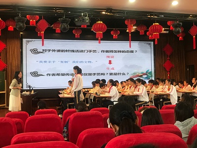 华东师范大学宝山实验学校的王汶老师,淞谊中学漆花萍老师分别执教七年级《江城子·密州出猎》和八年级《外婆的手纹》。《江城子·密州出猎》是七下第六单元“宋词集萃(上)”中的第一首词,在课堂教学的过程中,教师围绕提升学生的语言素养,引导学生关注动词、标点符号、修辞手法等语言形式,分析上片中的场景描写和下片中的情感变化,结合创作背景,体会作者豁达、乐观的人生态度。《外婆的手纹》是八下第六单元“生命的沉思”中的一篇散文,教师在课堂教学中首先预设了主问题,引导学生逐步生成核心问题链,再进一步解读外婆的处世态度和人生态度,最后结合全文体悟作者的人生态度。两位老师从不同角度切入,将宋词和散文文体的特色融入教学中,使学生有所收获,呈现了两堂精彩生动的公开课。