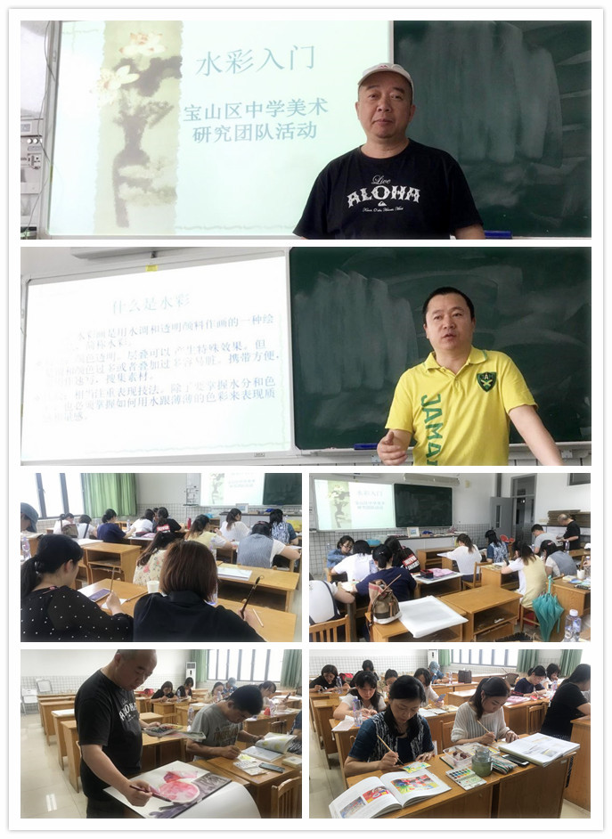 2019年6月10日周一下午宝山区中学美术研究团队在首席教师行知中学胡军老师的带领下,在罗店中学开展了水彩画入门体验活动。