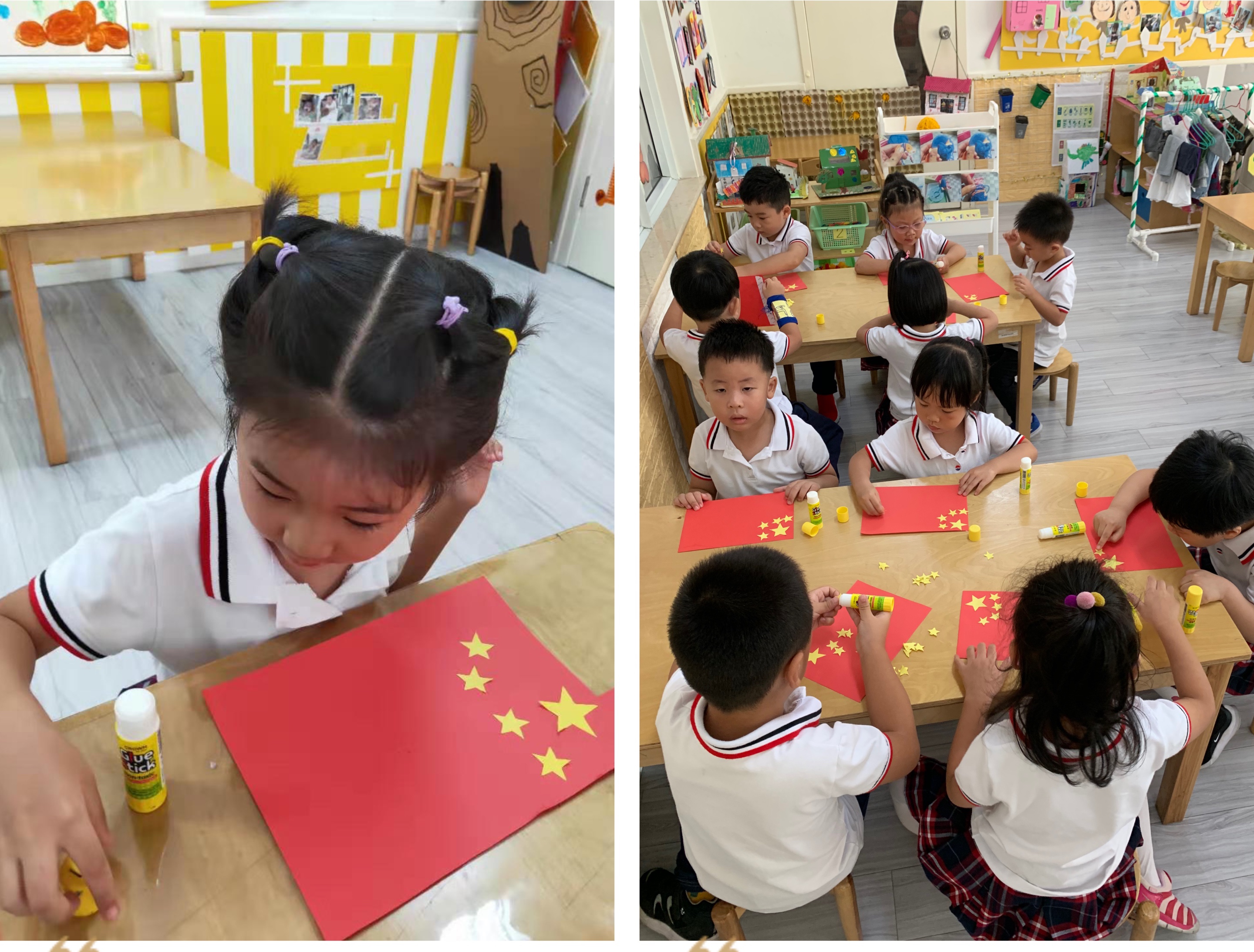 请宝贝们知道国旗是由一个和大五角星和四个小五角星组成并初步了解五星红旗的含义。之后我们自己制作国旗,和我们自己动手制作的国旗一起合影留念。