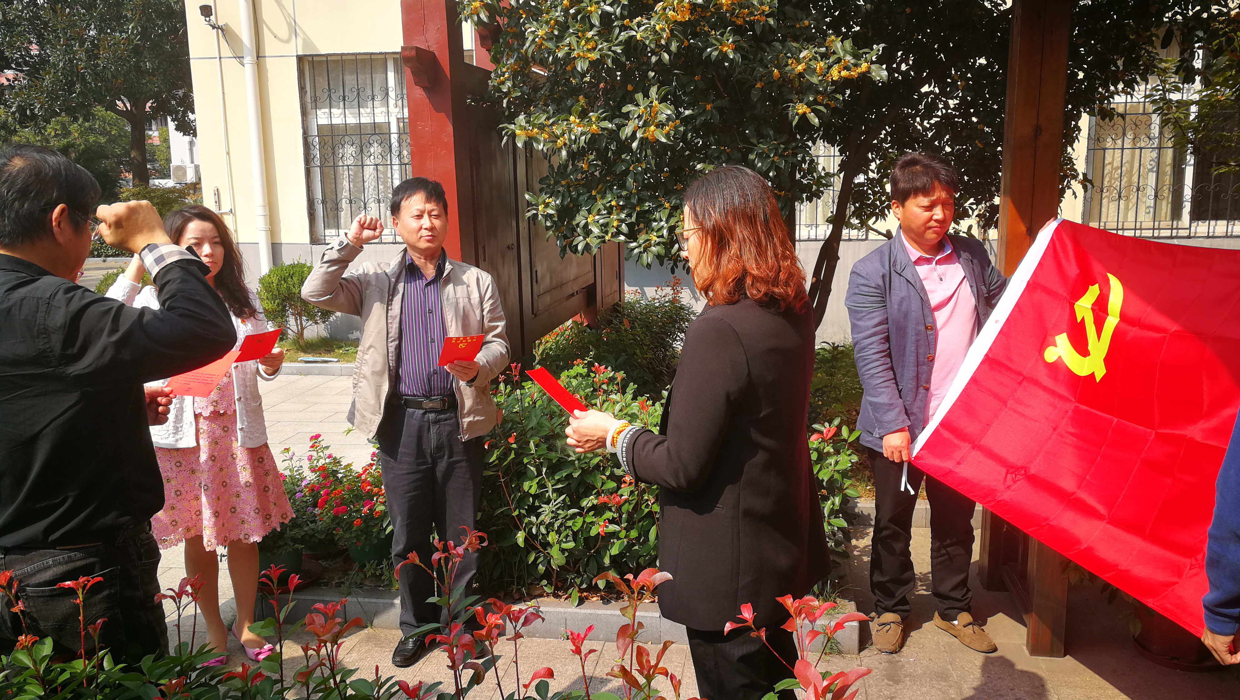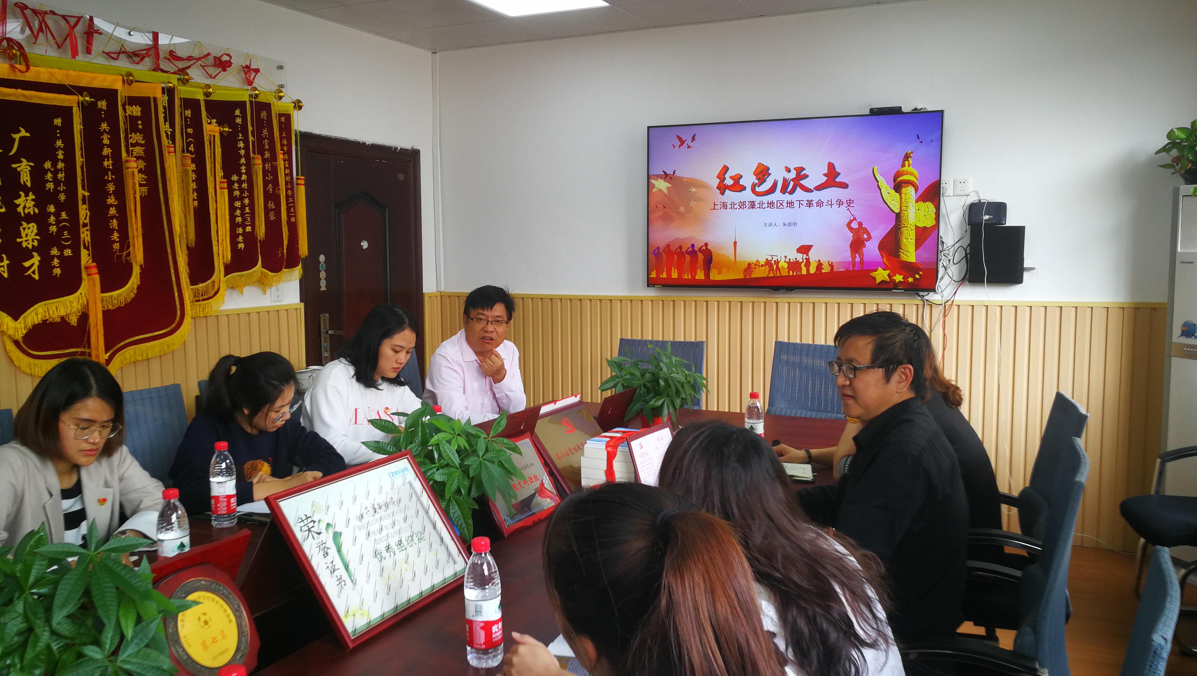 在共富新村小学,全体党员干部集体瞻仰参观了藻北小学复名缘记碑,在碑前,上海市行知中学附属宝山实验学校党支部书记杨定蕾带领全体党员重温入党誓言。并邀请共富新村小学党支部书记朱德明上了一堂《红色沃土》主题党课,重温了中共地下党组织在宝山成长、壮大的发展史和为人民解放事业不懈奋斗的革命史。他们的故事深深地吸引着我们,像一枚枚烙印刻在我们的心上,似一盏盏明灯指引着我们。其次,为了更好践行“藻北”和陶行知“捧着一颗心来,不带半根草去”的崇高精神,上海市行知中学附属宝山实验学校党支部书记杨定蕾和共富新村小学党支部书记朱德明向上海市行知中学附属宝山实验学校2位11月份入党的同志颁发政治生日贺卡,且向共富新村小学党支部赠送了《陶行知教育名篇(读本)》。