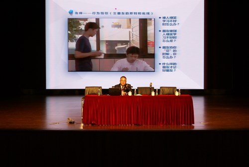 他先由一例热血青春的视频引导同学们正确认识青春期的自己,对同学们的日常行为加以具体指引,使之学习管理情绪的方法;强调家庭中父母对未成年子女有法律规定的监护、抚养、教育之责任;申明学校有教育、管理和保护学生的义务,并着重明确了同学们在学校有遵守法律、法规,遵守学生行为规范和学校管理条例,尊敬师长,养成良好品德和行为习惯,努力学习,完成规定学习任务之责任。