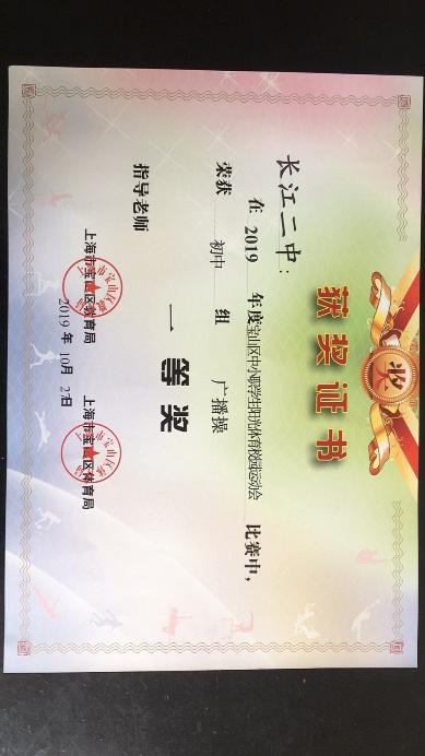 2019年宝山区第四届运动会暨中小职学生阳光体育大联赛广播操比赛于10月27日上午在宝山区罗店中学操场拉开了序幕。参加此次初中组广播操比赛的学校共27所,上海市长江第二中学广播操队荣获宝山区初中组的一等奖。