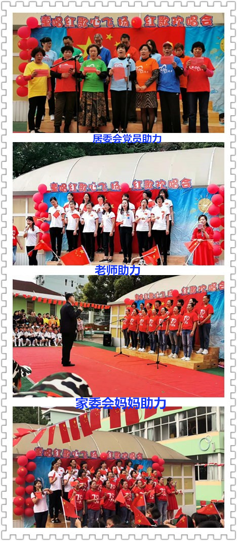 “小人儿童唱爱国歌,大人儿共筑爱国情”,当一首首红歌被孩子稚嫩的歌声唱出,当居委会党员和家委会代表感人抒唱,当全体教师《我和我的祖国》的歌声飞扬------那熟悉又令人激动的旋律,萦绕在每一个孩子耳边,铭刻在每一个活动组织者与参与者的心中。