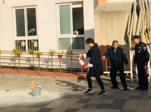 下午三点,消防警铃传遍全园,各班教师迅速按照紧急预案的疏散路线带领幼儿拿起湿毛巾,捂住口鼻,弯腰小步快走,分楼梯迅速且有序地下楼。很快孩子们都集中到操场安全区,教师迅速清点人数,确保每个幼儿安全撤离。接着教师和孩子们一起在现场实操演练了灭火器的正确使用方法。