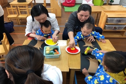 虽是秋日,但暖阳高照,宝宝们牵着爸爸妈妈的手,高高兴兴得来到了幼儿园,一起参加活动。宝贝们在教室门口依次晨检,一进教室,孩子们就被幼儿园的各种玩具吸引住了。大华一幼的老师结合早教活动的主题“秋天”以及我园的“玩美”特色,根据不同年龄的孩子的特点设计了丰富的亲子活动,如颜料拓印、撕贴画等。在活动的最后,每个班的老师都针对每一阶段婴幼儿的特点,有侧重的进行了科学育儿知识的分享和交流。