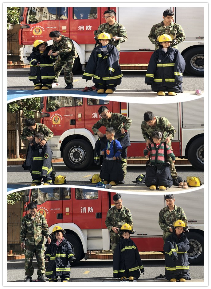 随后,消防员叔叔和孩子们进行了密切的互动,首先演示了如何快速穿上消防装备,其次学习了灭火器的使用方法以及一些常用的消防工具的用途和使用方法,并请个别幼儿来进行实际操作。还详细地讲解了防火的具体措施及自救知识,大家听得聚精会神。