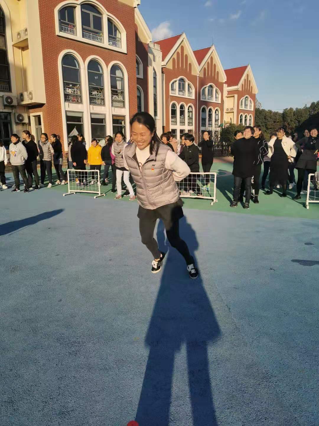 在蛙跳比赛中,教师们下蹲不断向前跳跃的模样真像一只只可爱的小青蛙们,在赛场上奋力前行,个个都不甘示弱呢!