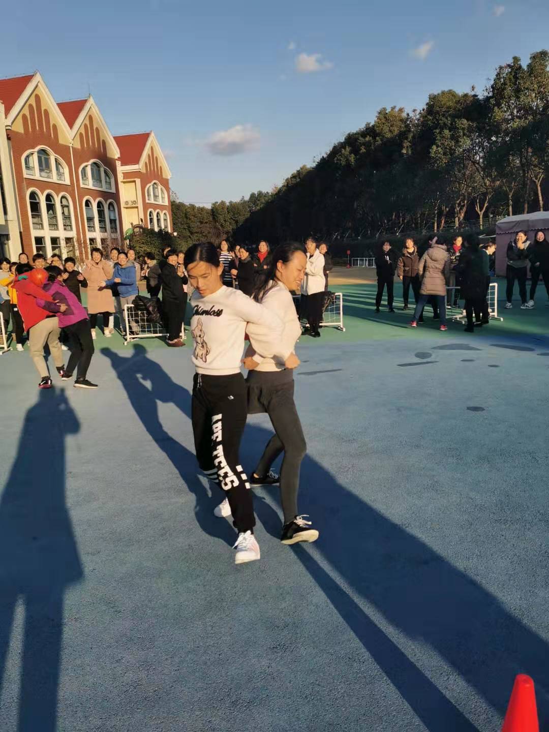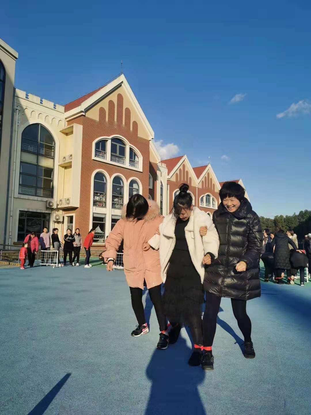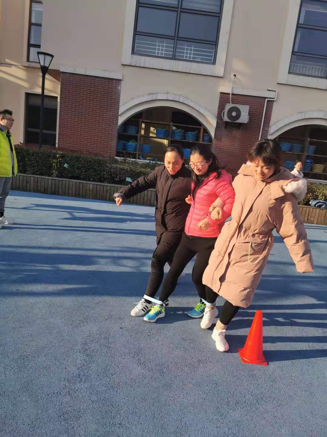 瞧,三人两足的比赛活动中,教师们三人互相拥抱搀扶,探索如何走得稳又快的技巧,在行进过程中,一声声“一二一二”的整齐的步伐声,一声声教师伙伴们的加油鼓劲声响彻整个操场,比赛中的欢声笑语、笑容满面在晚霞的映衬下宛如一道美丽的风景线!