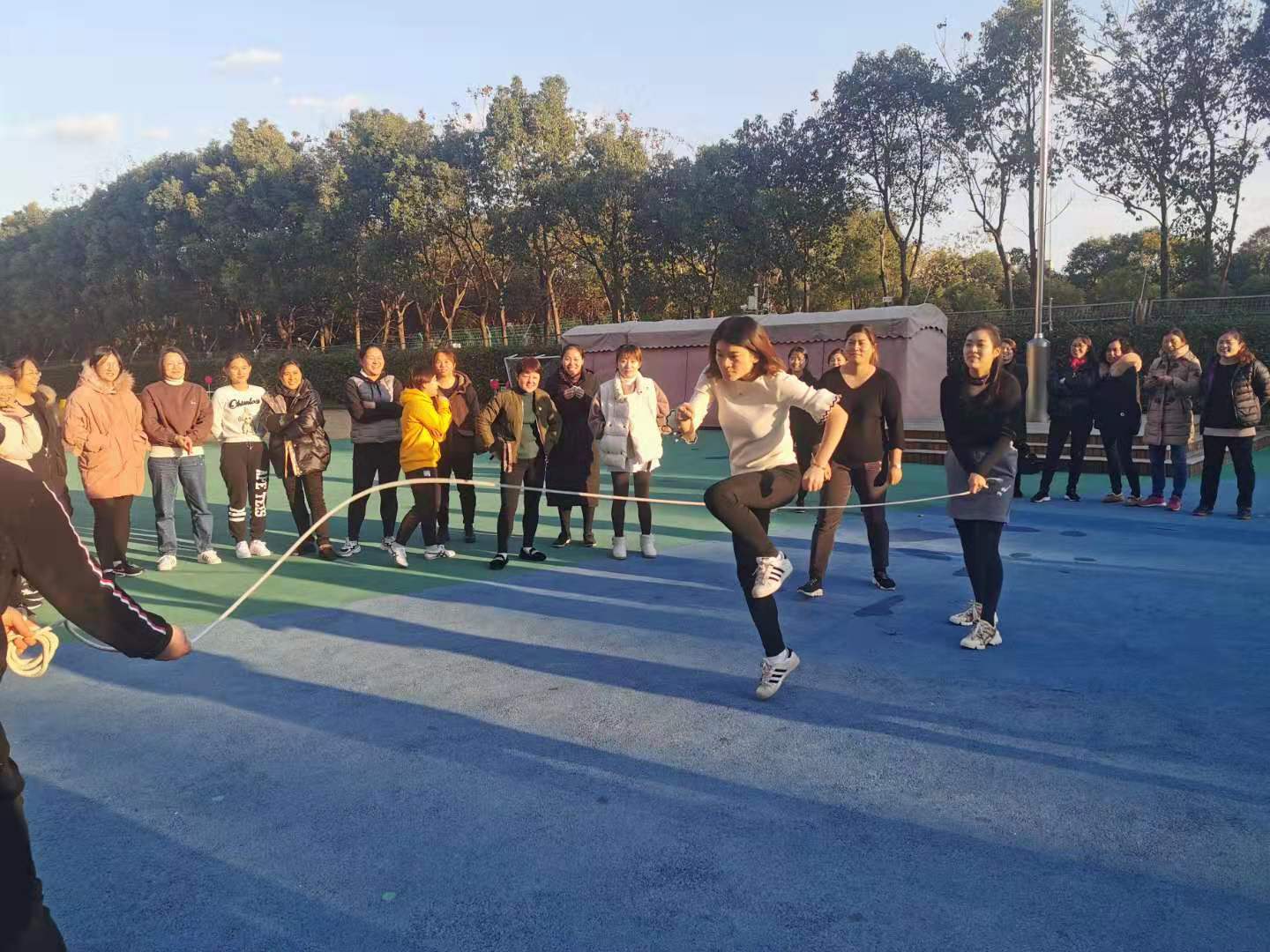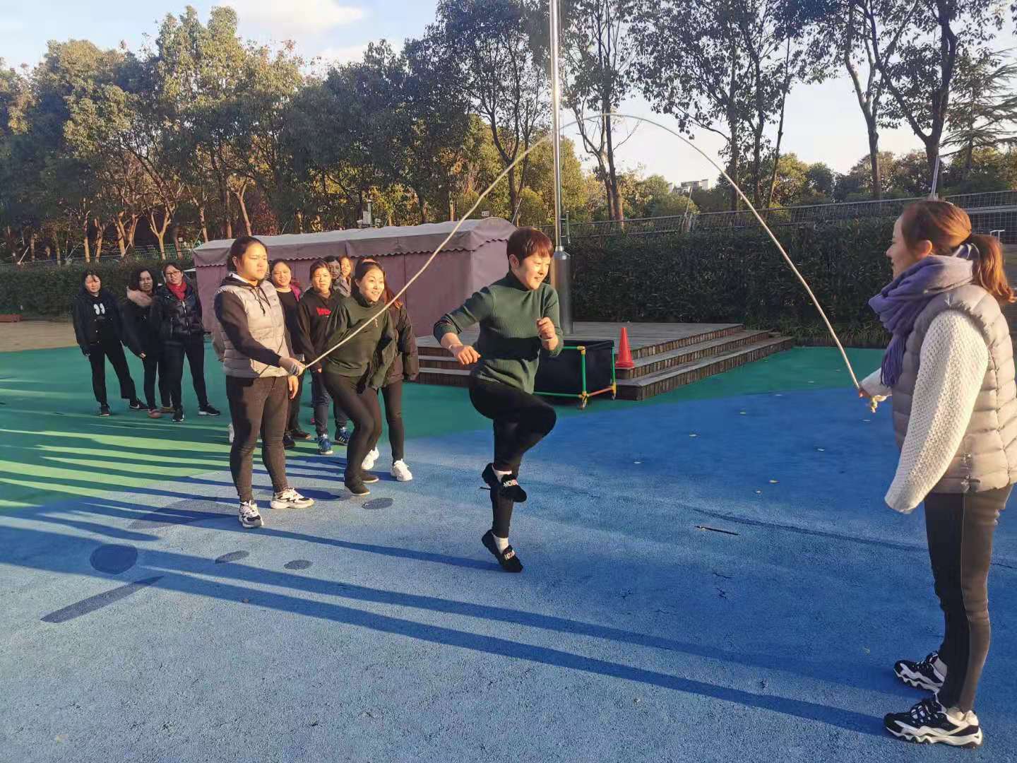 在长绳比赛中,各个团队都排成了一列列长长的火车,在一个一个接连跳跃中,犹如长长的火车连绵不绝驶向开心地旅途!