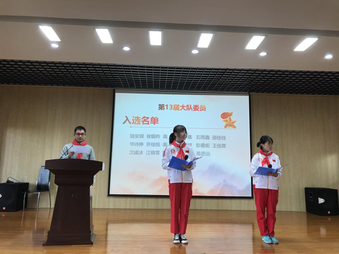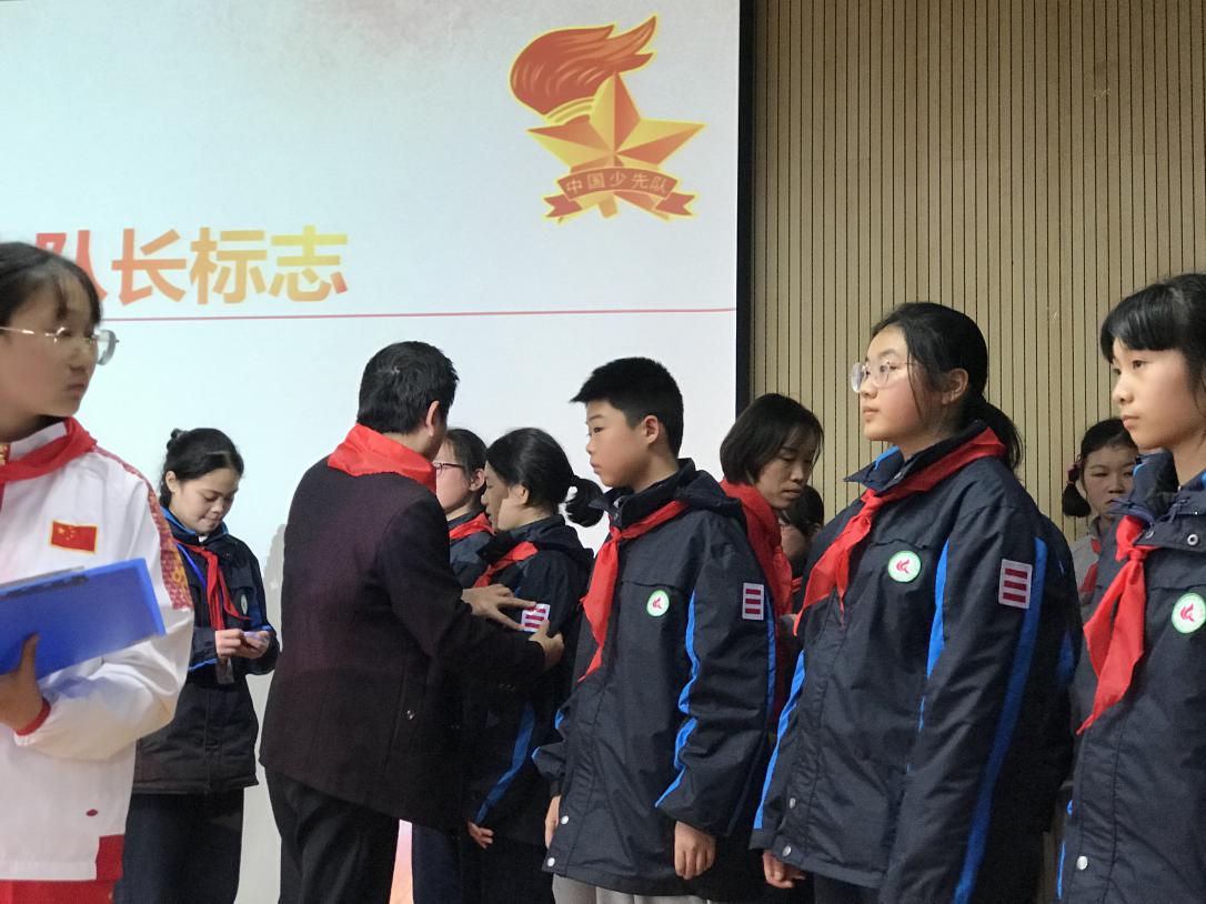 大队辅导员周老师宣布新一届大队委员会名单,与其他领导们一起为新当选的大队委员们授标志。
