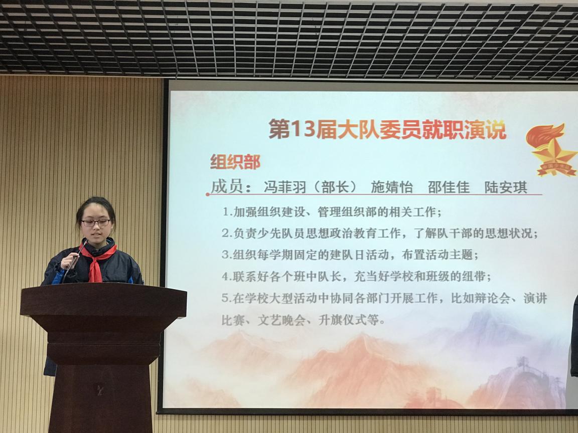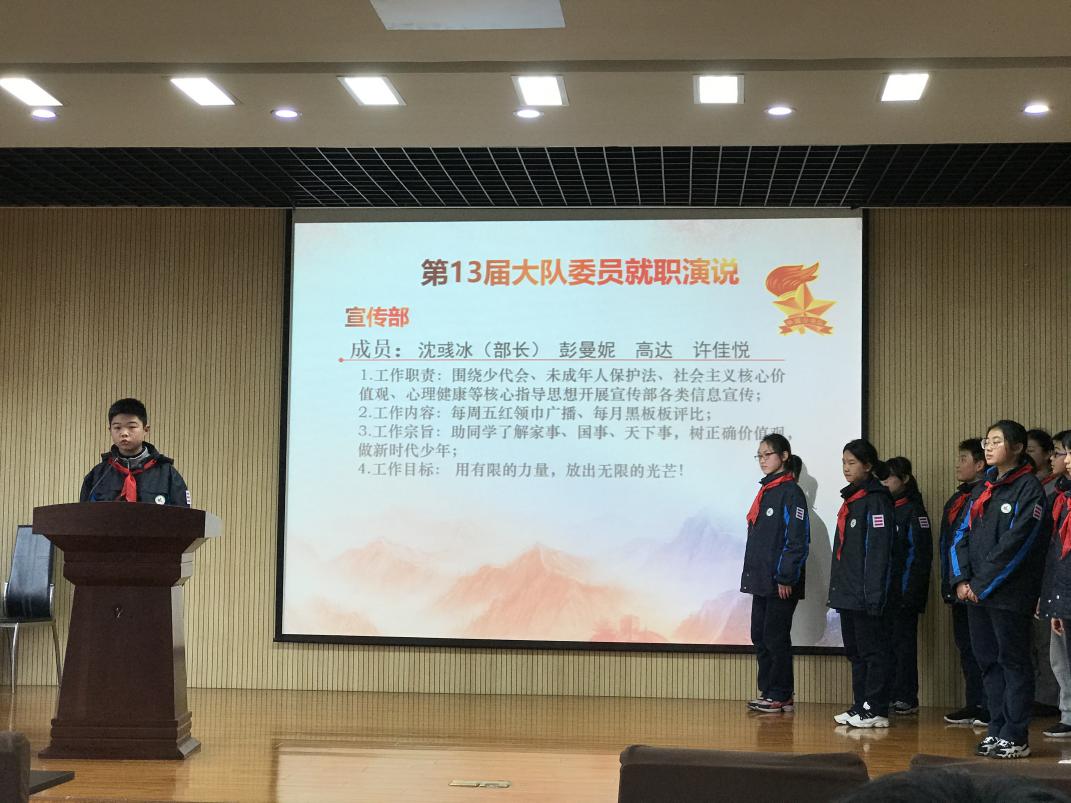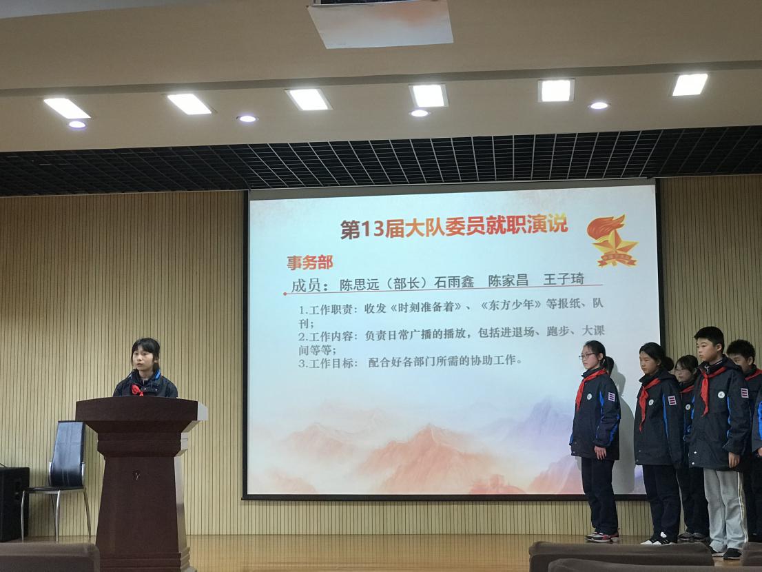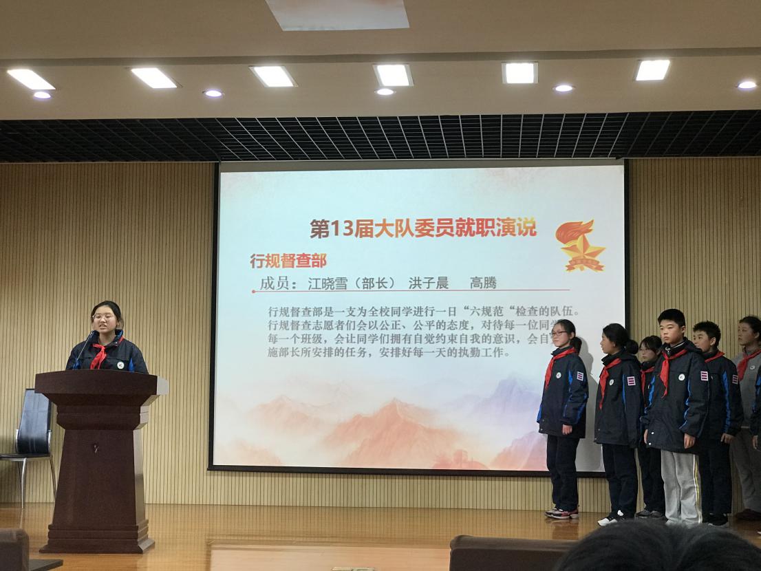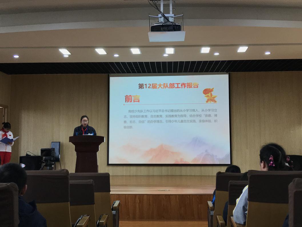 随后,第12届大队委员会委员朱思雨同学为我们做过去一年的大队部工作报告。我校少先队工作以习近平总书记提出的从小学习做人、从小学习立志,坚持组织教育、自主教育、实践教育为指导,结合学校“崇德、博雅、宏志、自信”的办学理念,引导少年儿童亲身实践、自主体验、积极创新。报告具体从“常规化仪式教育重在个体参与感、大队引领中队自主因地制宜开展队活动、加强红领巾社团建设学校特色显著”三个方面回顾了一年来大队部工作情况。