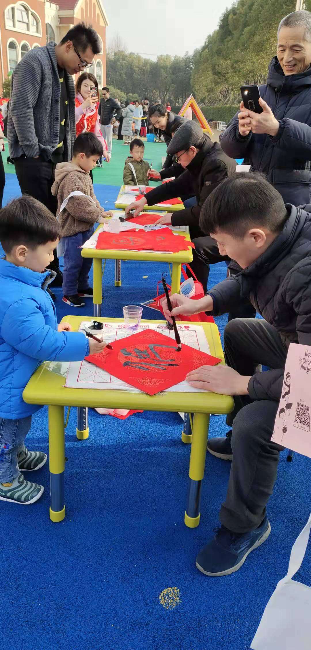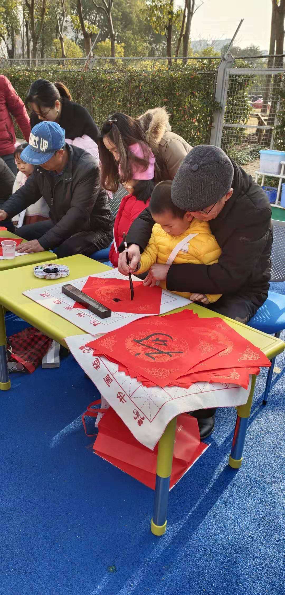 写福字,贴福字更是新年的标配,“宝贝,和爸爸一起来写福字吧!”爸爸的大手和宝贝的小手一同紧握毛笔,一个个福字展现在红纸上,舞龙舞狮更是深受孩子们和爸爸妈妈们喜爱的活动,孩子们扮演着活泼的小狮子,一只只可爱的小狮子和小龙们在亲子共同挥舞中跳跃着……欢畅着……诠释着新年喜气洋洋的愉悦心情!