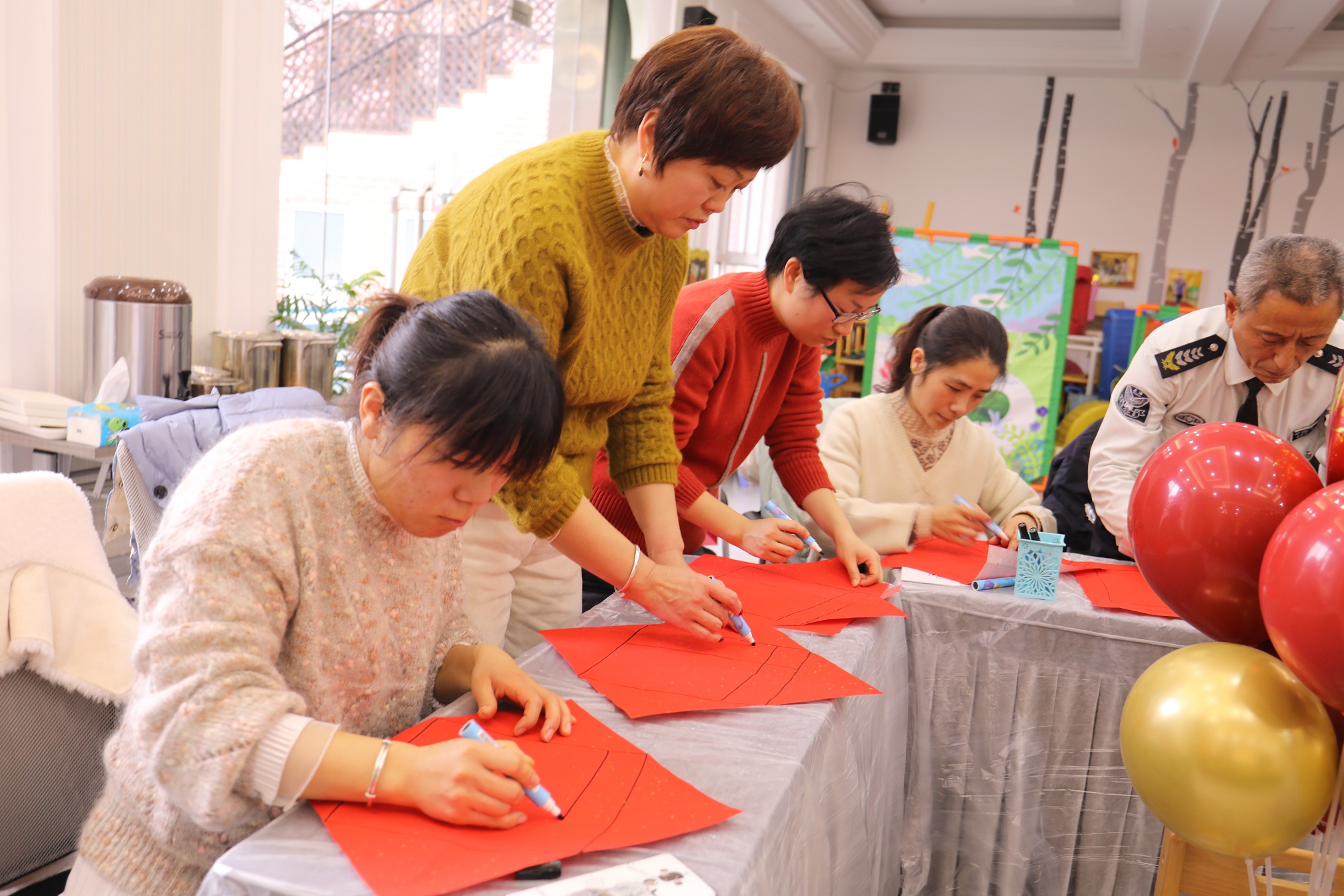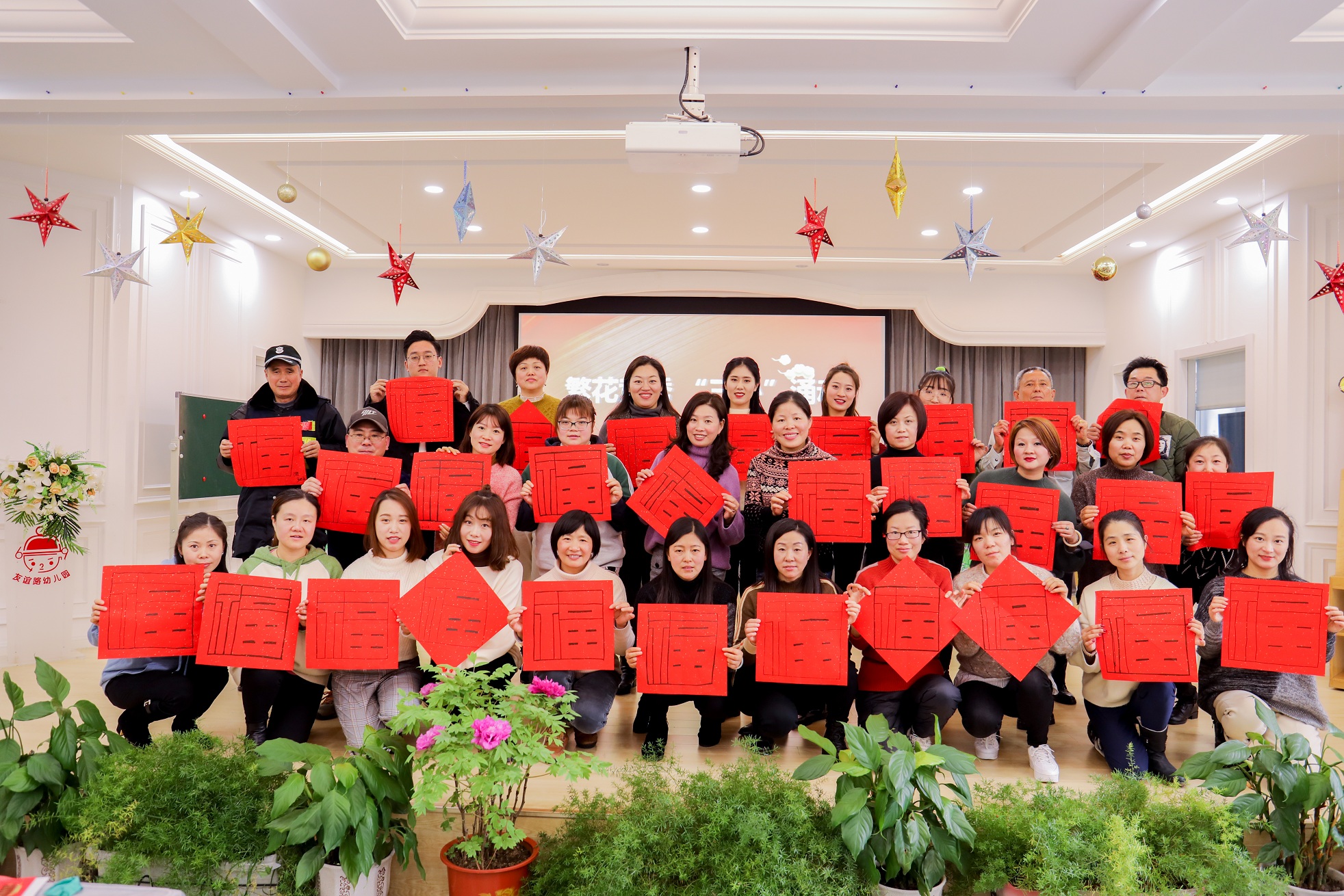 年会中青云社的老师们表演了精彩的歌舞,后勤组的保育员们深情地朗诵了诗歌。有趣的团队游戏,手机互动游戏让大家体会到了团队共同努力的快乐。领导班子不仅教教师们共同书写福字,还带来了宝山区教育局给教育者们的来信,三位年轻的教师代表分别诵读了信件,向所有教工们传递了新一年上级领导对广大教育者们的殷切希望。