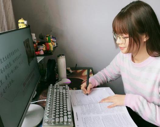 同学们在爸爸妈妈的督促和陪伴下,静静守候在书桌前,认真观看央视的线上课程。即使在舒适的家中,大家也丝毫没有松懈,坐姿端正如身在课堂中一般。