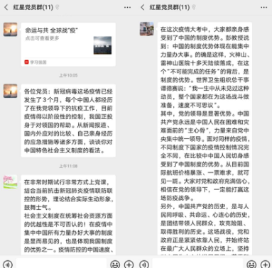 首先,全体党员上网观看彭宗安教授的微党课——《强大的制度优势是克疫制胜的法宝》。而后书记在党员群中就“结合全国抗疫实况,谈谈你对中国特色社会主义制度的看法”,展开讨论。党员们有的说:“党中央一声令下,全国人民集体响应,体现了中国速度和中国效率”;有的说:“最令人振奋的火神山的建设速度,体现了党急人民所急,和强大的执行力”;有的说:“中国共产党听得到民声,看得到问题,经得起非议,顶得住压力,体现了我们的党大国担当的气度和能力”;还有的说:“国务院联防联控机制运作有力,各部门心系群众的生命安全,各司其职,任劳任怨,反应灵敏,勇挑重担,体现了党员干部是有能力听命令”。书记总结:“我党一心为民,在这场战疫中身先士卒,反映了初心;团结一致、责任担当、智慧研判、不畏阻力体现了共产党人始终把使命担在肩上。作为一名党员,更要关注时事,增强理论功底,站在政治的高度来看中国发展,时刻牢记初心使命,身体力行做好每件应该做的事、做好别人不愿做的事,在群众间树立模范党员的形象”。支部要求各位党员在疫情防控期间,充分利用“学习强国”学习平台,理论学习不放松,履职尽责不停步!在最后,党员们递交了特殊党费。