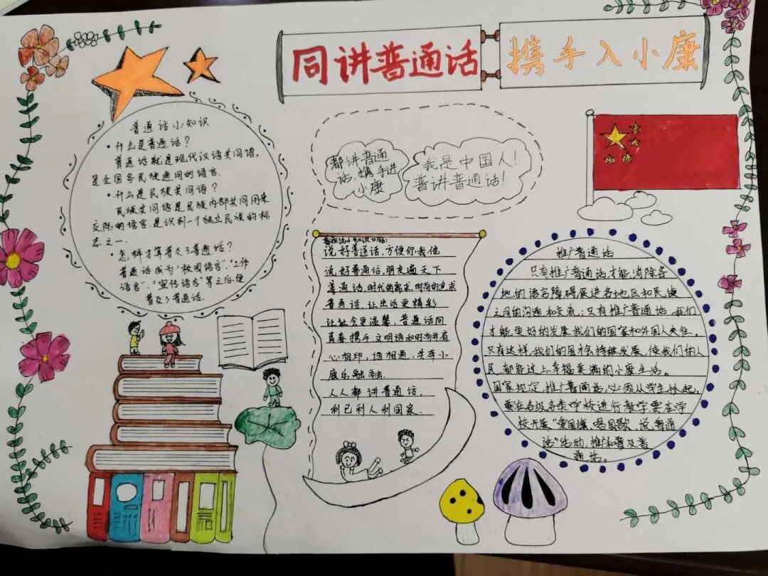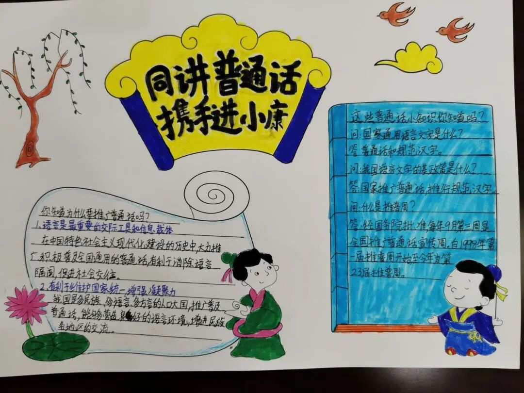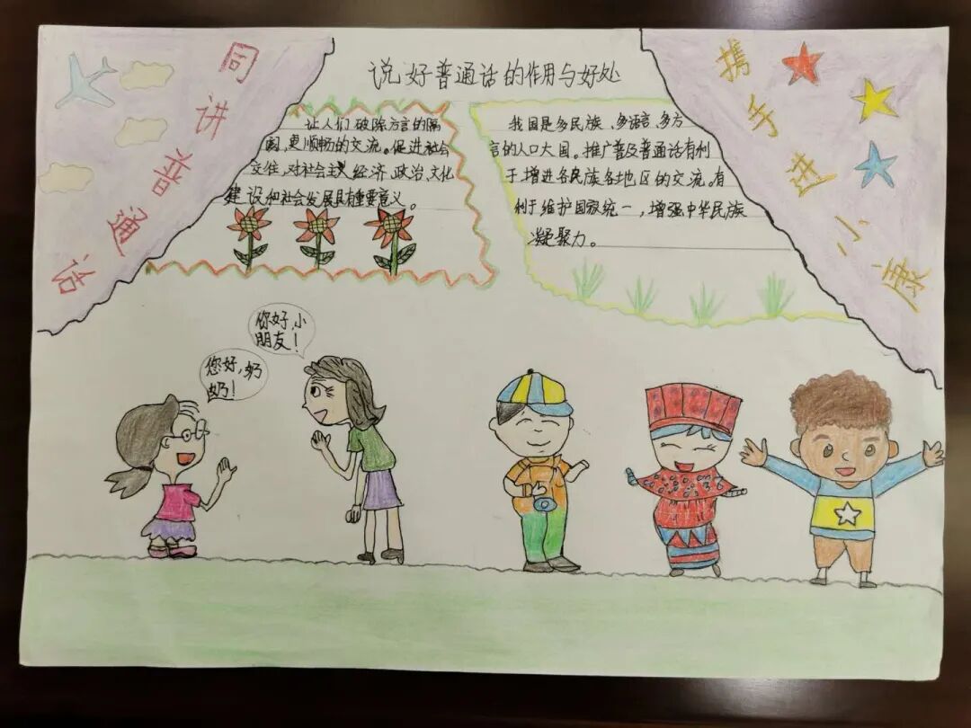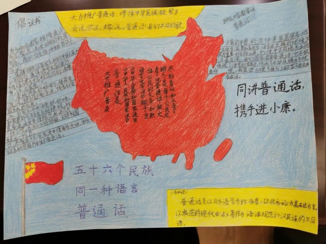 走进教学楼,每个班的黑板报都焕然一新了!”班里的文艺委员带领三两个得力小帮手,大家你一言我一语,献计献策,完成了一幅幅板报,走进班级,课间小朋友手里还攥着蜡笔、水彩笔,画纸上排版清晰,结构精巧的普通话宣传小报诞生了。