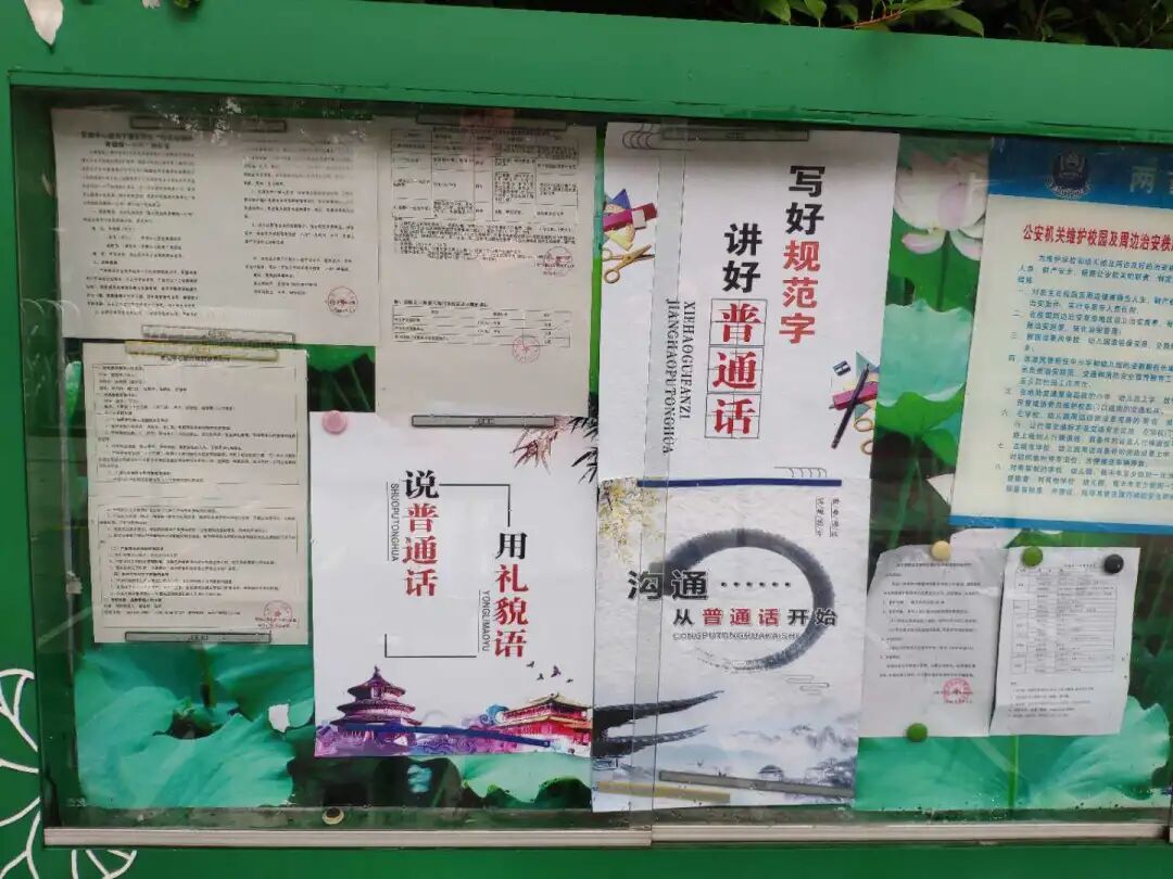 走进校门,映入眼帘的便是一条长长的宣传标语——“同讲普通话,携手进小康”,下面的宣传栏里早已贴满了一张张告示,如“沟通,从普通话开始“、“说普通话,用礼貌语”、“学说普通话、练习普通话”等等,营造了推普周的氛围。