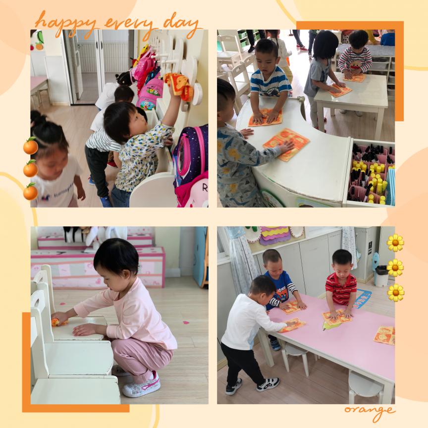 在大扫除的过程中,孩子们感受着快乐。小班的孩子虽然动手能力相对较弱,但是他们把自己的桌子、椅子擦得认认真真。