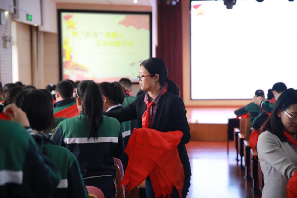 授大号红领巾:各中队辅导员为队员们授红领巾。
