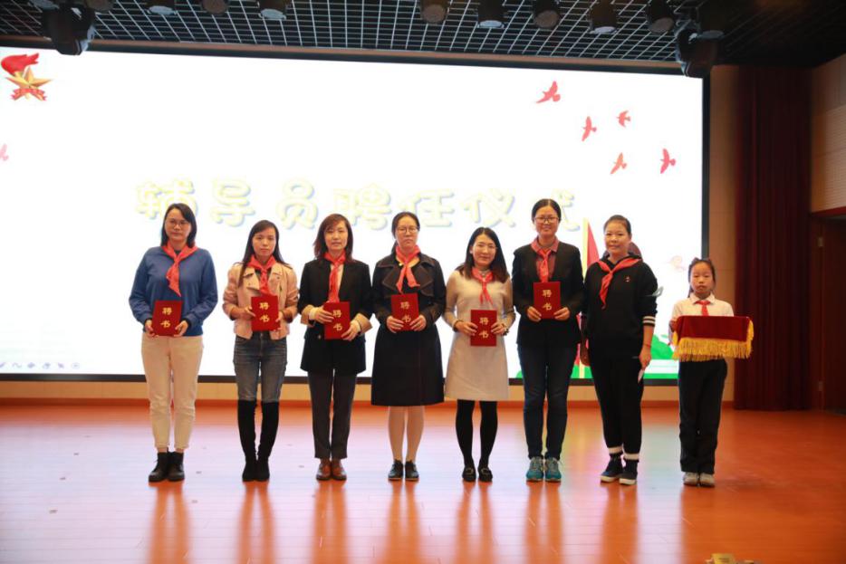 中队辅导员聘任仪式:副校长宣读六年级新中队辅导员名单,并为他们颁发聘书。