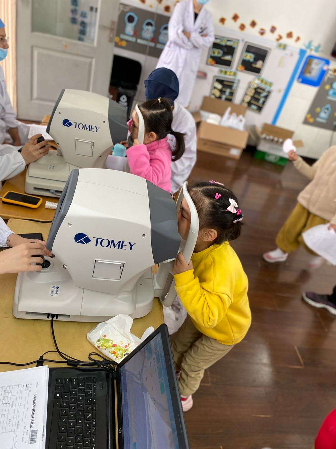 活动根据幼儿的年龄特点在同年级展开,教师以绘本故事、儿歌、游戏、绘画等方式为载体,帮助幼儿了解均衡饮食、合理用眼对眼睛的益处,鼓励幼儿进行学习与表达,通过自主探索发现眼中世界的美好,感知明亮双眼的重要性。同时,幼儿园还与社区医院医教结合,对中大班的小朋友开展了视力检查,检查中采用屈光检测,以更精密的仪器反馈幼儿的视力情况,并在后续对检查的结果持续跟进,确保发现问题能及时反馈、尽早干预。