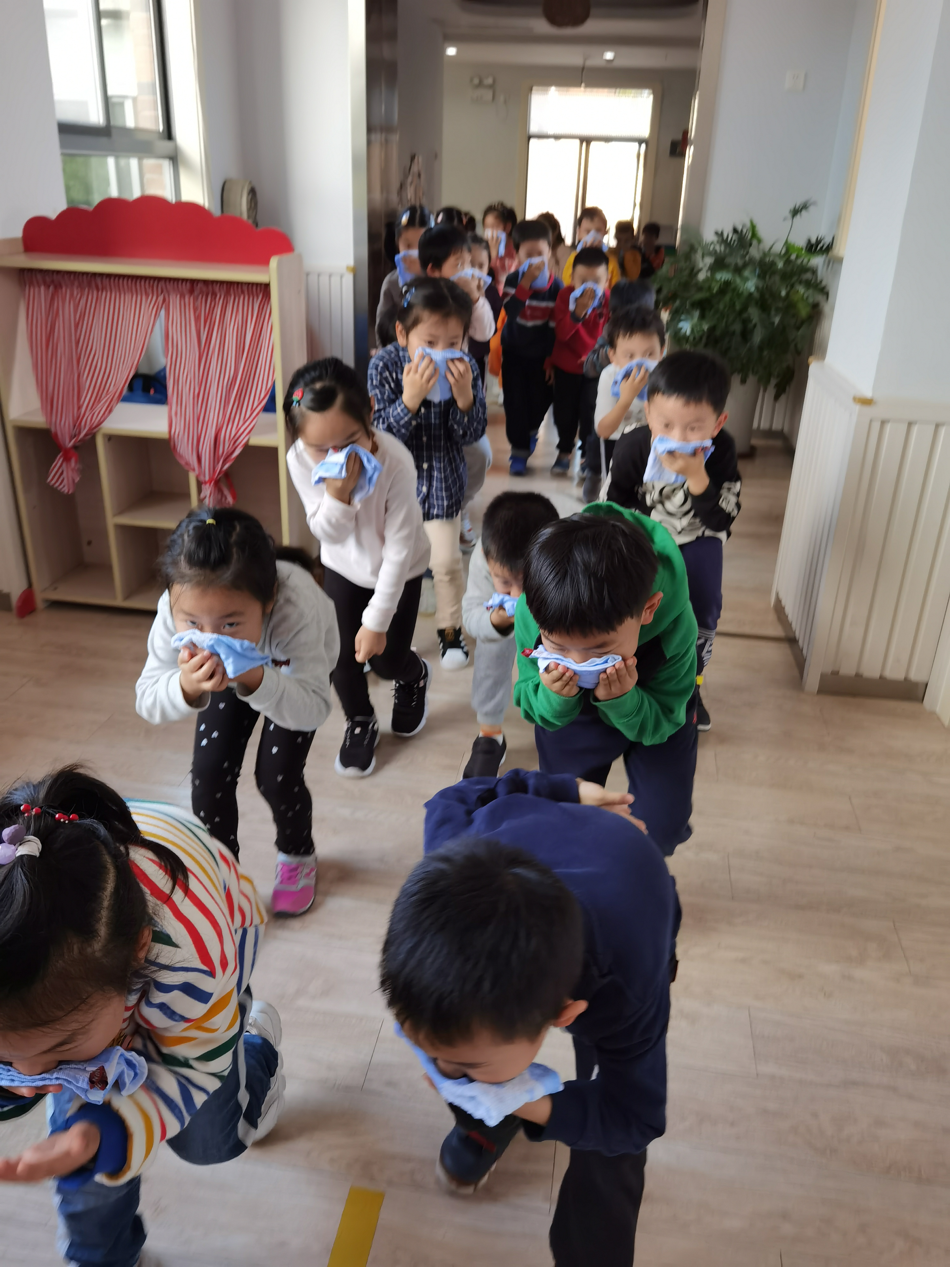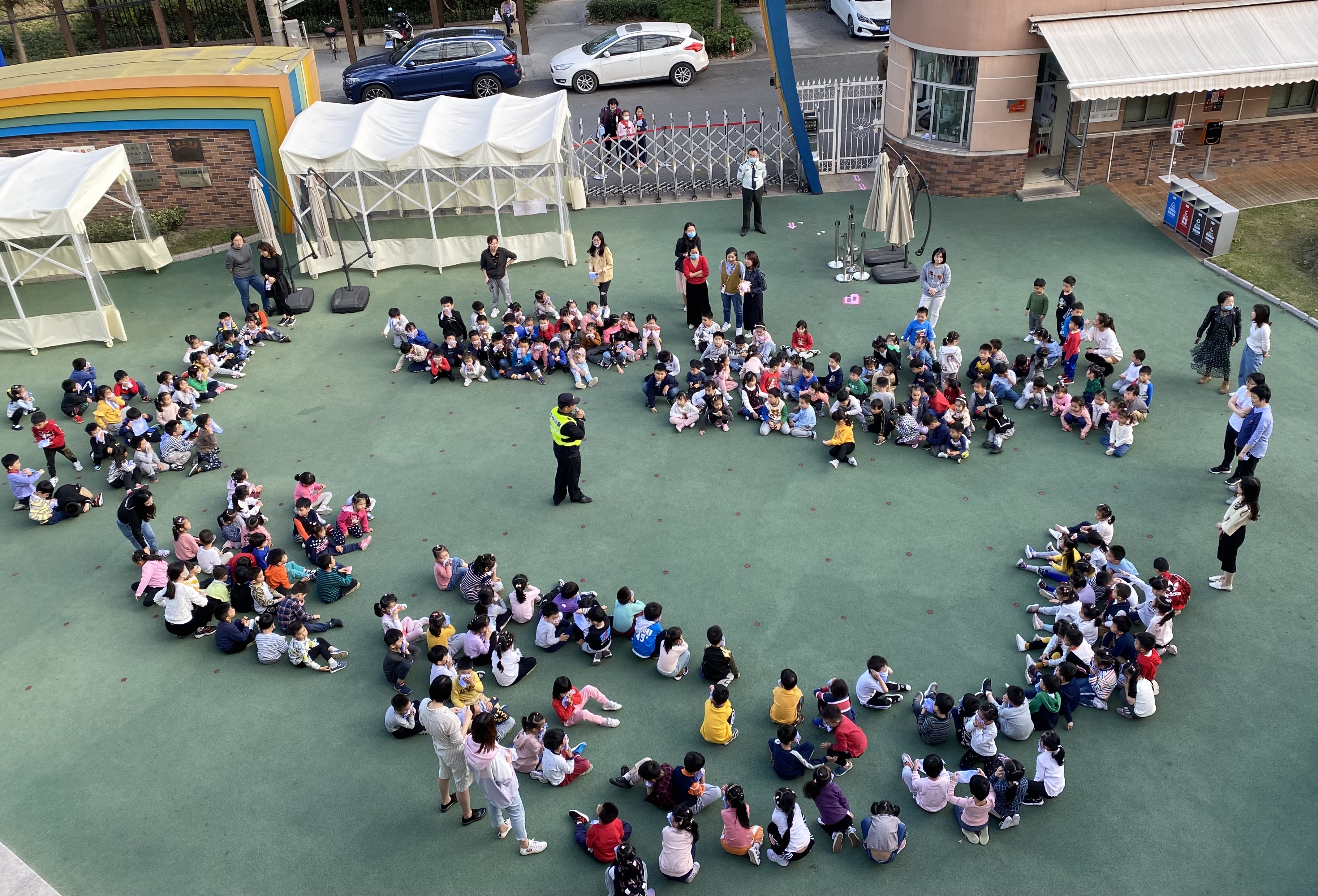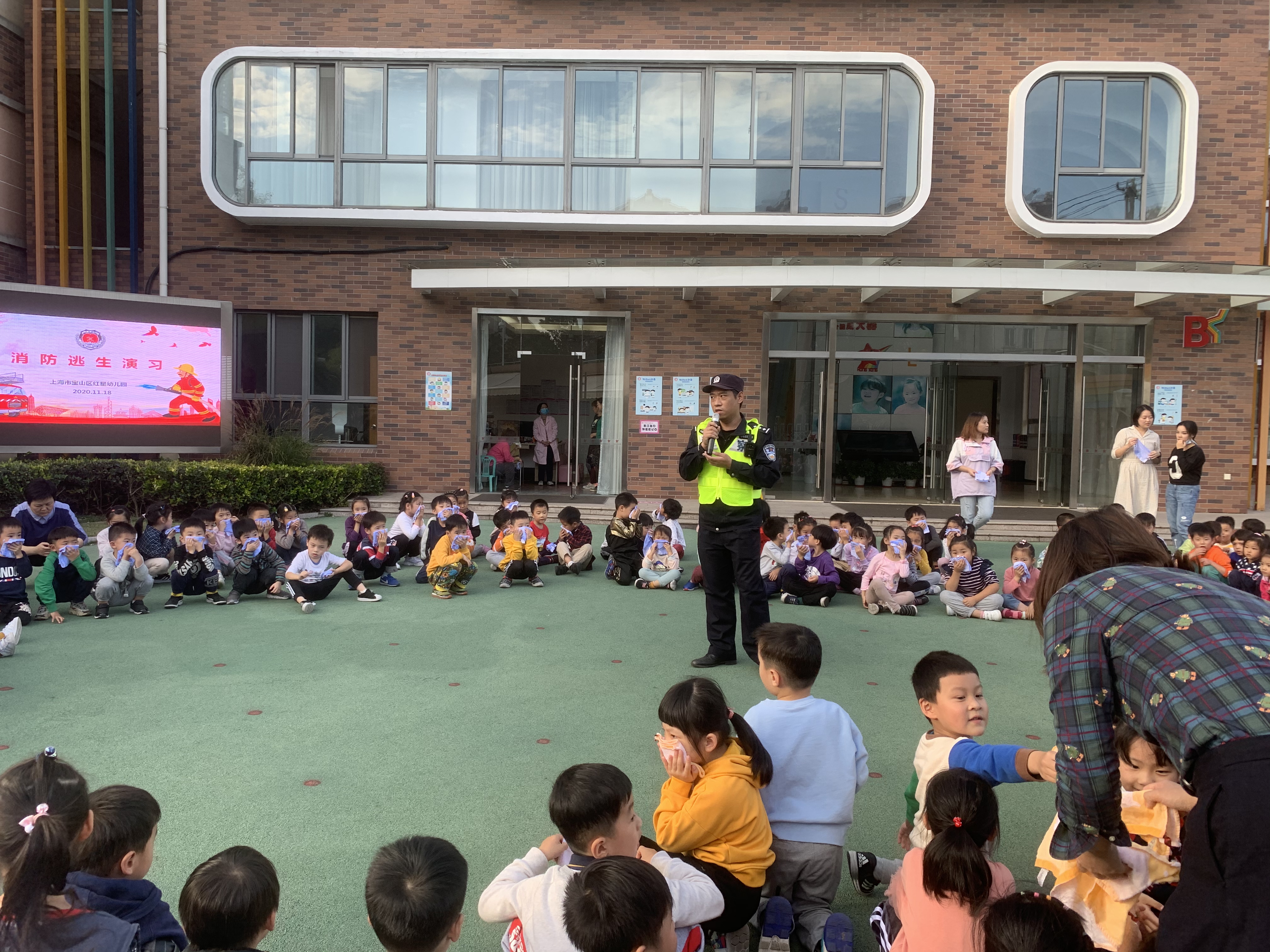 下午15:00警报声响起,各班教师迅速按紧急预案的疏散线路带领幼儿拿起湿毛巾,捂住口鼻,弯腰小步快走,分两道楼梯迅速且有序下楼。途中,孩子们冷静且井然有序。很快孩子们集中到操场安全地带,教师迅速地清点人数,并向指挥教师报告。整个疏散活动用时3分钟。