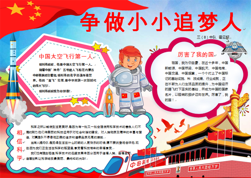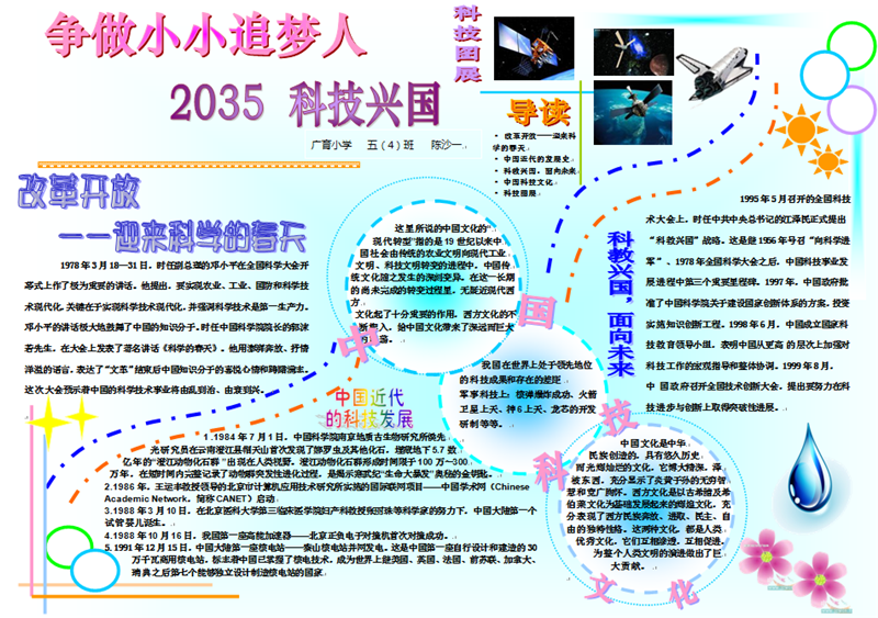 结合活动主题,队员们对2035年的城市、交通、生活等方面进行了畅想,并设计制作了电子小报,生动形象的描绘出了对未来的畅想。