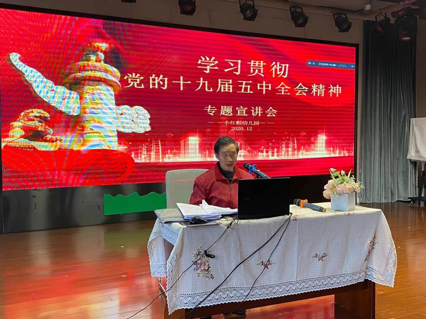 2020年12月4日下午,小红帽幼儿园邀请月浦镇宣讲团谢洪林老师为学校全体教职员工宣讲“学习贯彻党的十九届五中全会精神”。