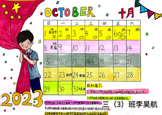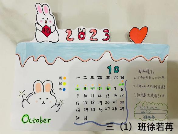 三年级学生通过观察生活中的日历、月历等物品,查阅学习相关资料,尝试自己做了一份2023年10月的月历卡。