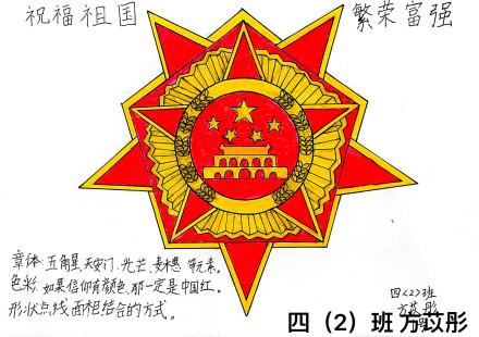 四年级的孩子们设计了别致的胸章,将五角星和一些数学符号运用在自己的胸章中,进一步感受了图形的美和数学的严谨,寄托了爱国情怀。