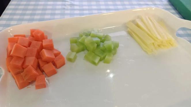 俗话说:“台上一分钟,台下十年功。”胡萝卜、莴笋和土豆在他们手中变成胡萝卜块、莴笋丁和均匀的土豆丝,他们各展所长,游刃有余又一丝不苟。
