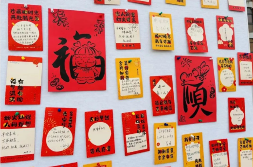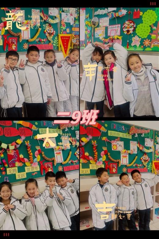 一张张熟悉的笑脸,一声声亲切的新年问候,一份份诚挚的祝福,构成校园最美的风景。同学们将寒假制作的龙年创意作品张贴在展板上,用福气满满的一面墙,为新学期带来红红火火的福气。