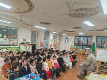 幼儿园的团员教师也走进社区,协同共建部队为群众开展了测量身高体重、测血压血氧、理发、磨刀、修理自行车等便民服务。解放军在志愿服务结束后也走进教室,为孩子们带来了雷锋的故事。