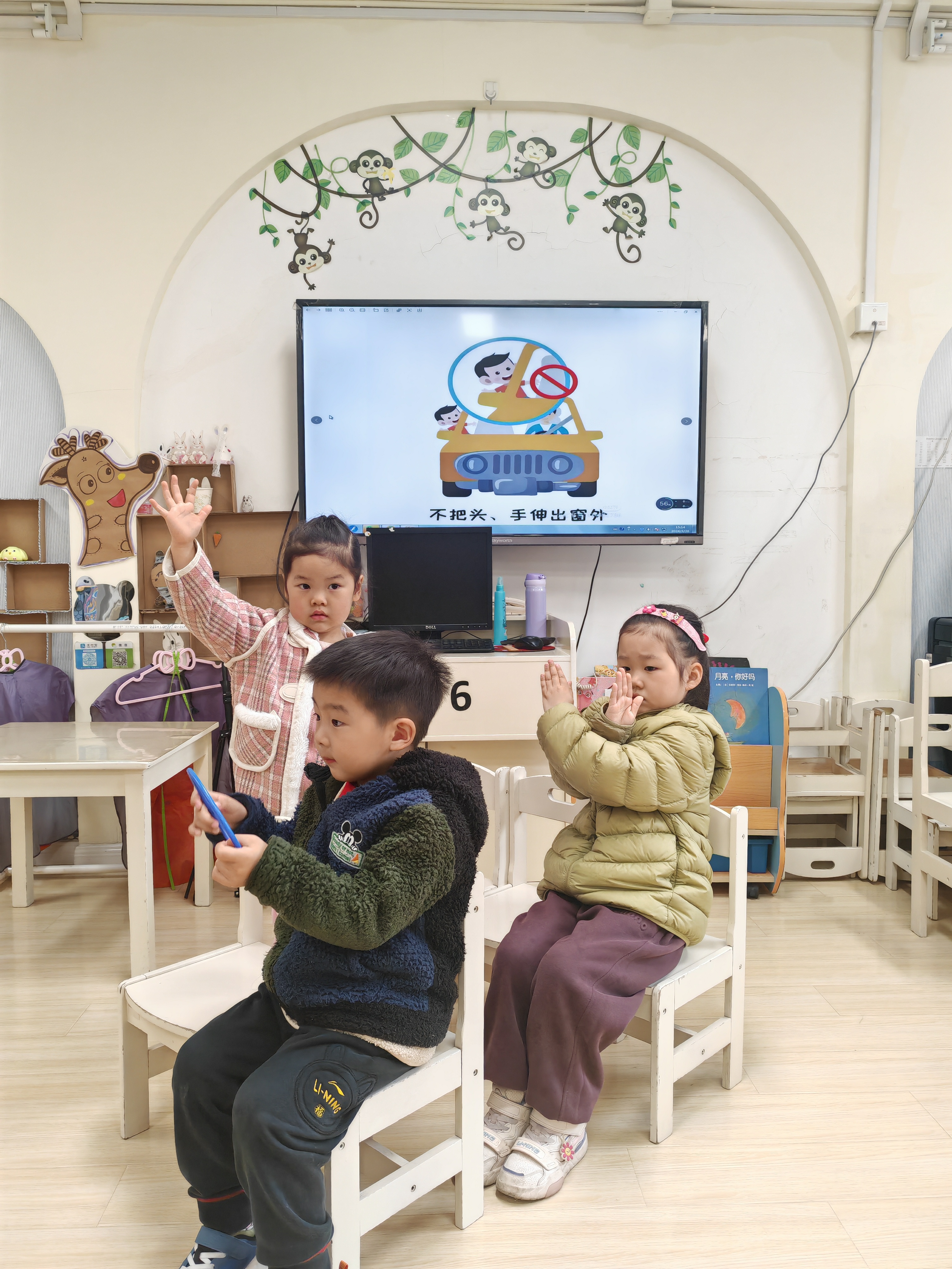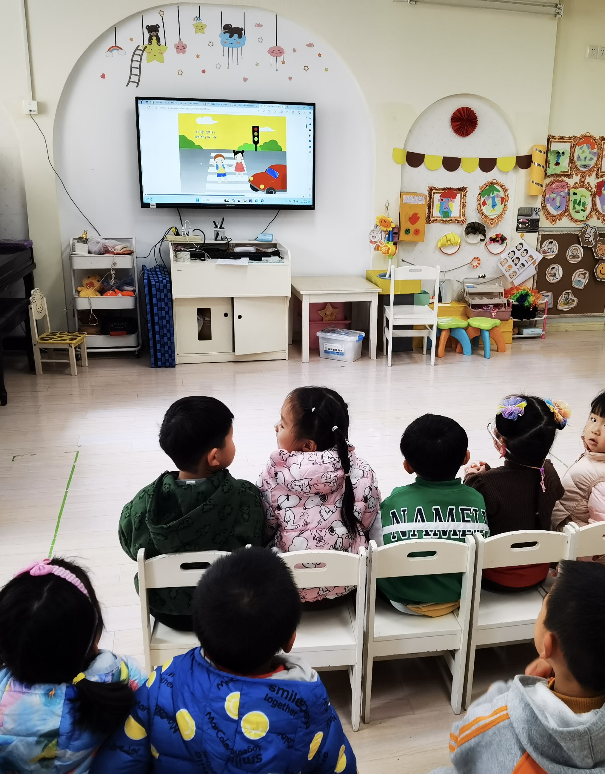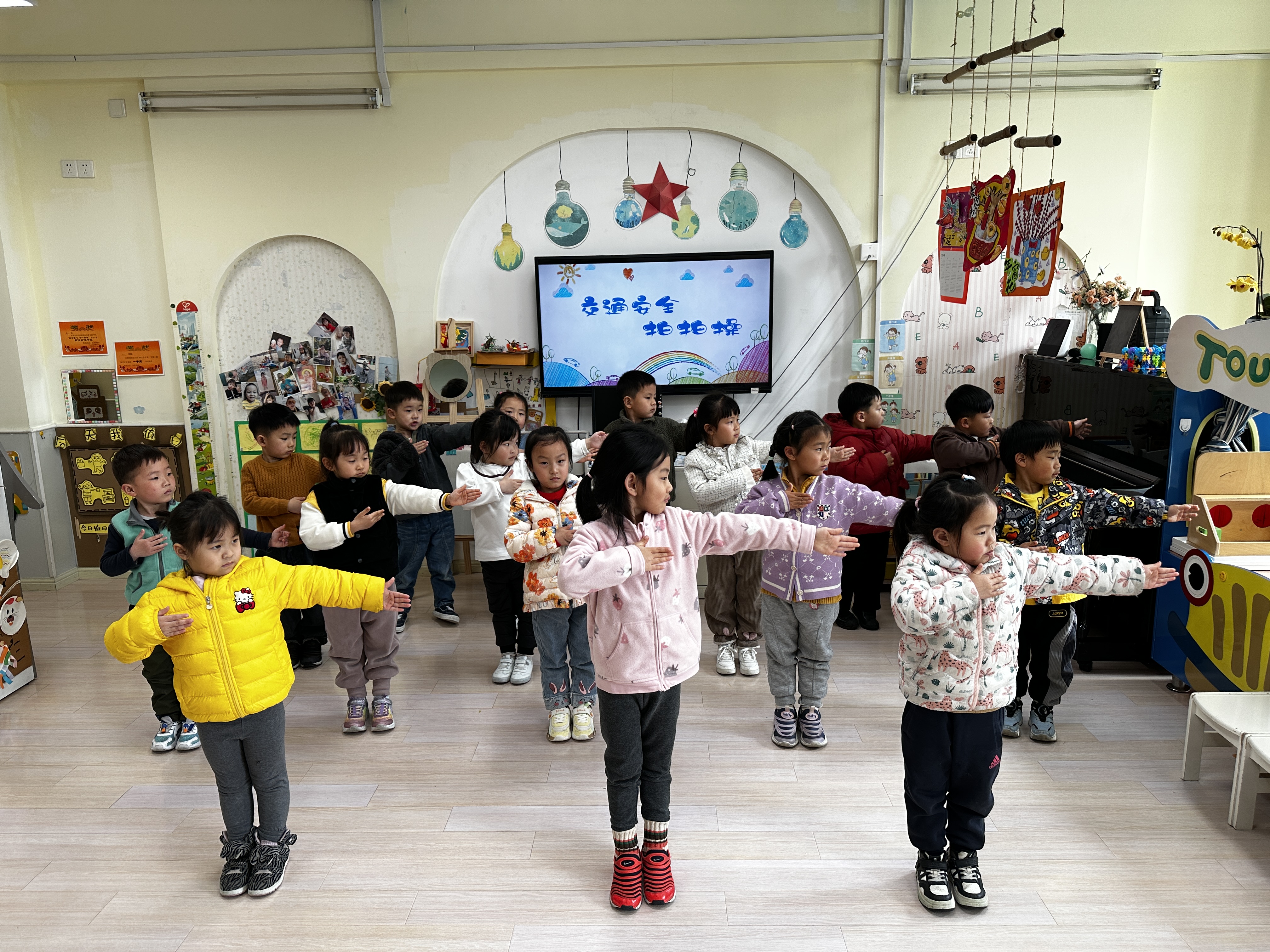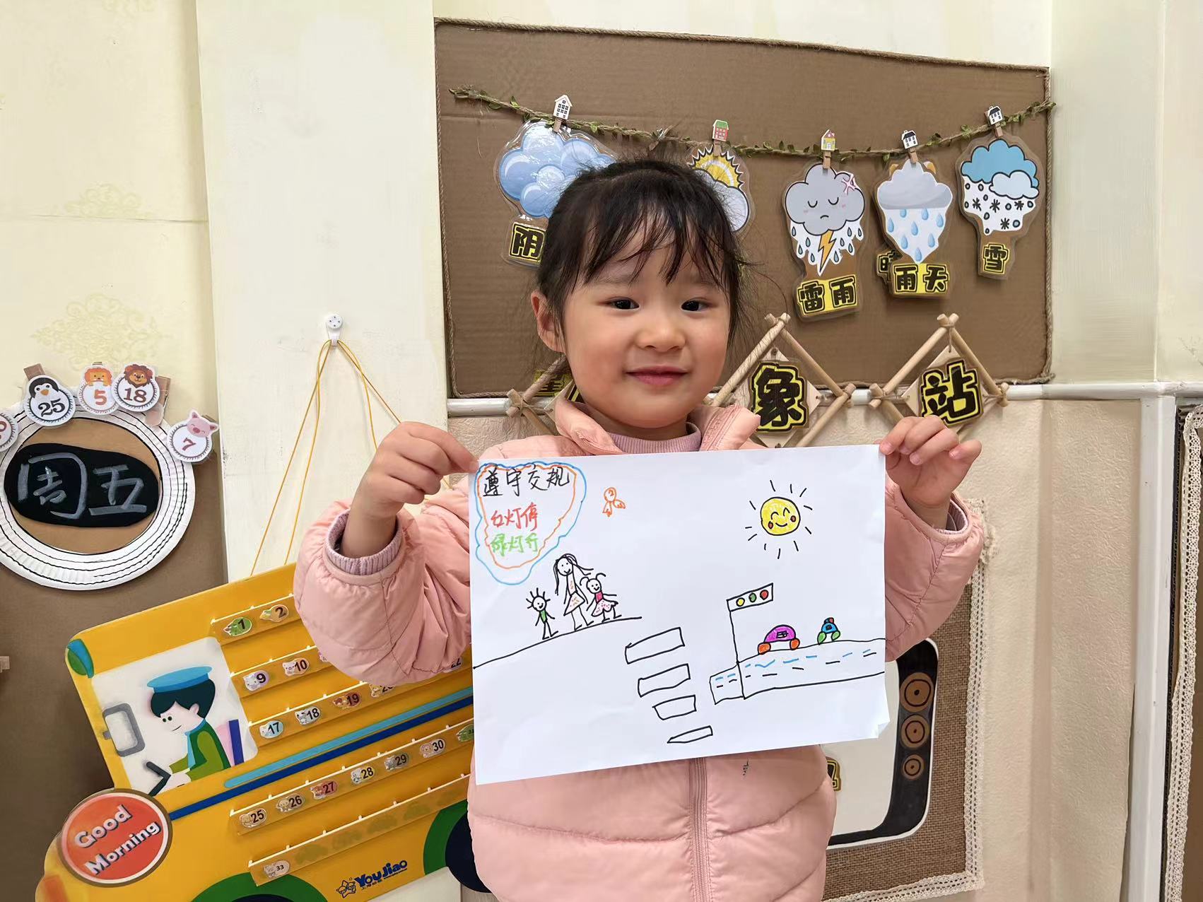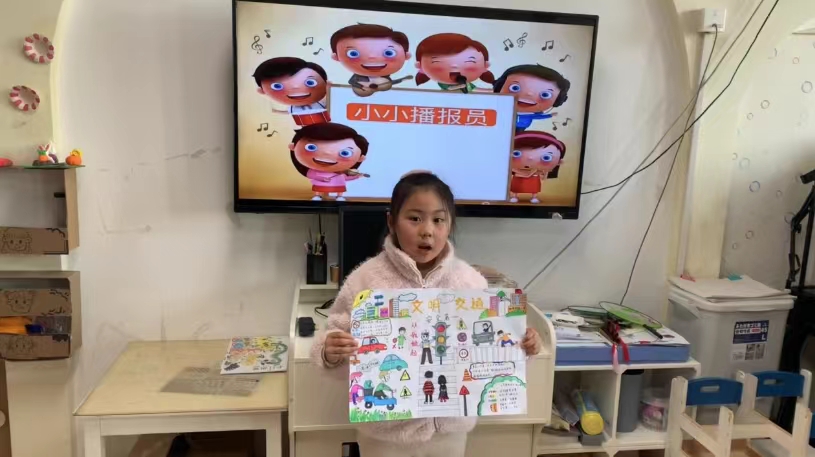 大班的小朋友们围绕“文明交通”积极开展宣传,绘制交通安全宣传画,利用环境创设让幼儿感知安全交通教育;通过新闻播报《文明交通》,利用榜样示范共同感知文明交通的重要性;共唱手指谣《交通安全歌》,帮助幼儿树立文明的交通安全意识。