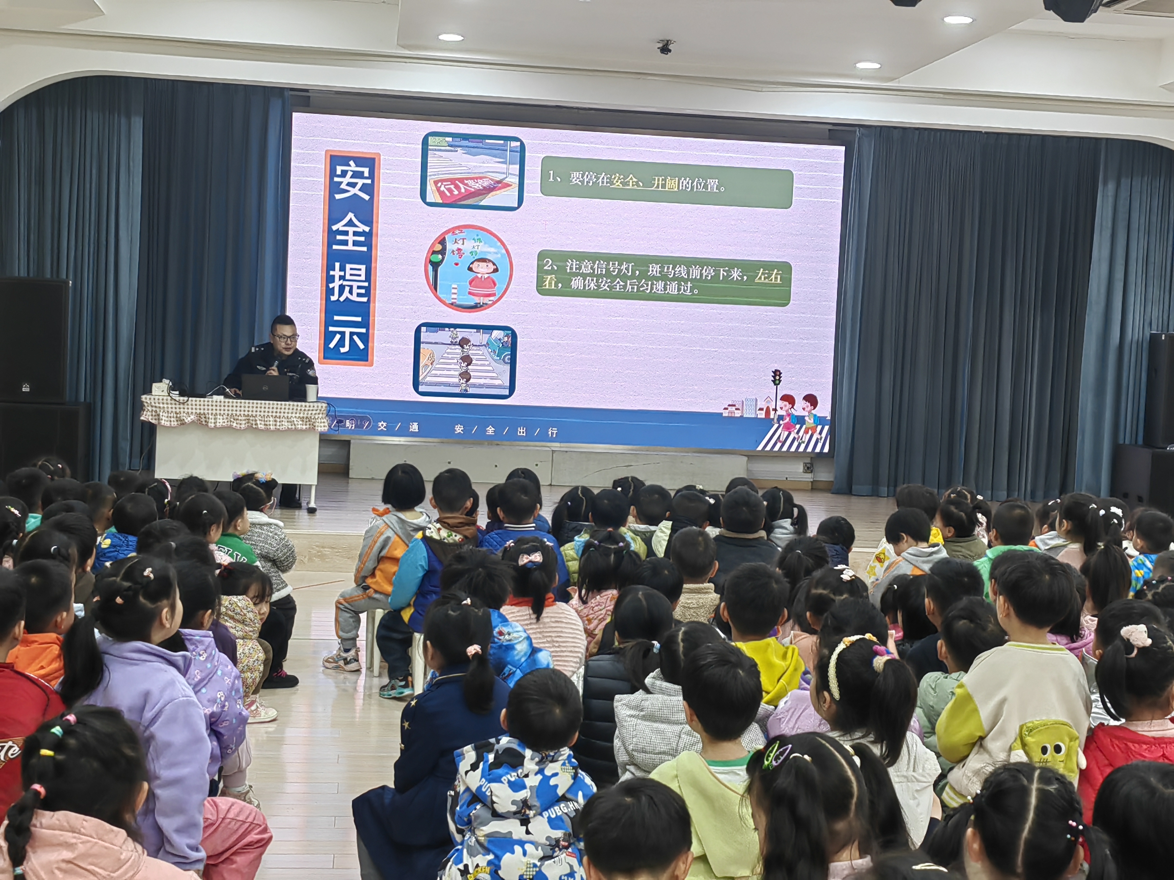 邀请顾村派出所民警走进幼儿园,面向全园小朋友开展《小细节大安全》未成年人安全微课堂,指导幼儿树立文明交通习惯并强化安全意识。
