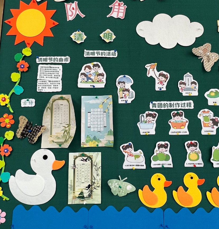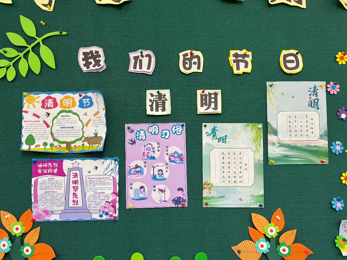 一年级的学生们在班主任老师的指导下,查阅资料,设计排版,制作了有关清明的主题小报,在班会课上和伙伴交流,并张贴在教室队角中,营造了浓郁的育人氛围。