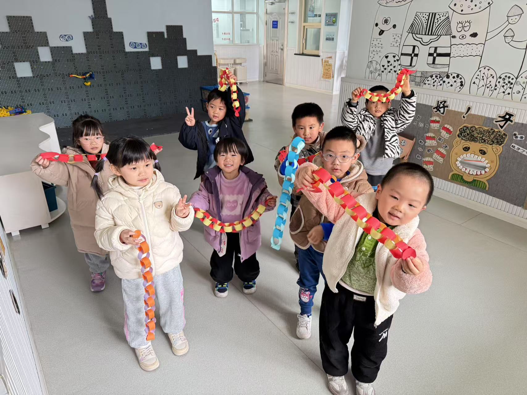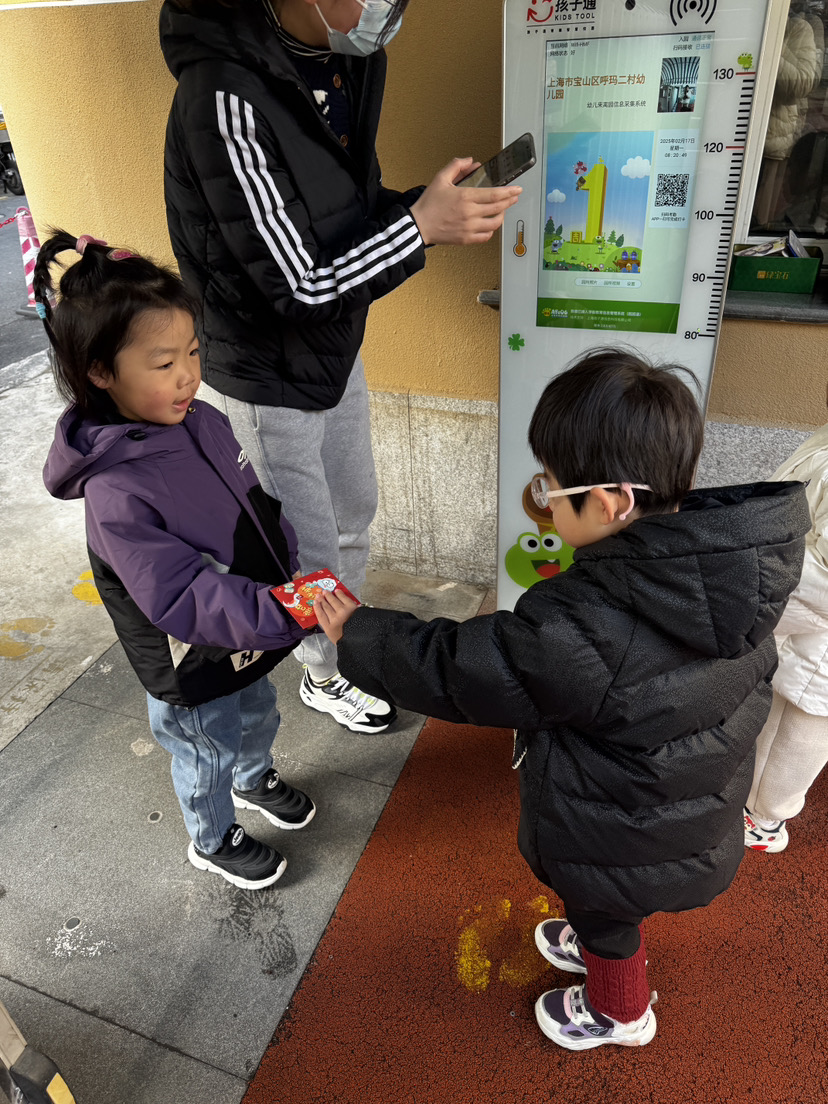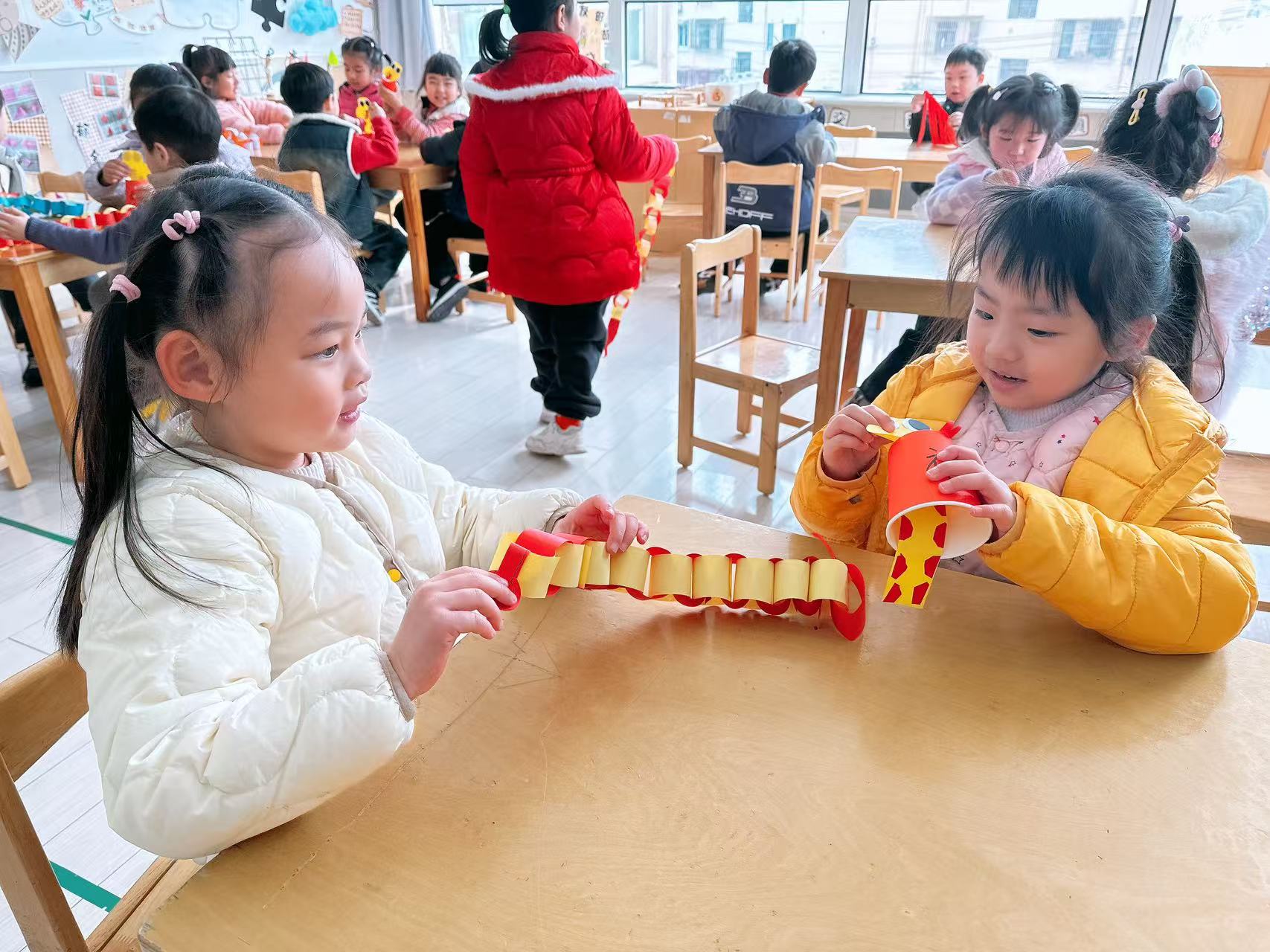 在开学第一周的周五,幼儿们还拿着自己做的新年手工,走出教室,去认识新朋友,“蛇年大吉”“恭喜发财”“年年有余”……一句句吉祥的话语在欢声笑语间传递。