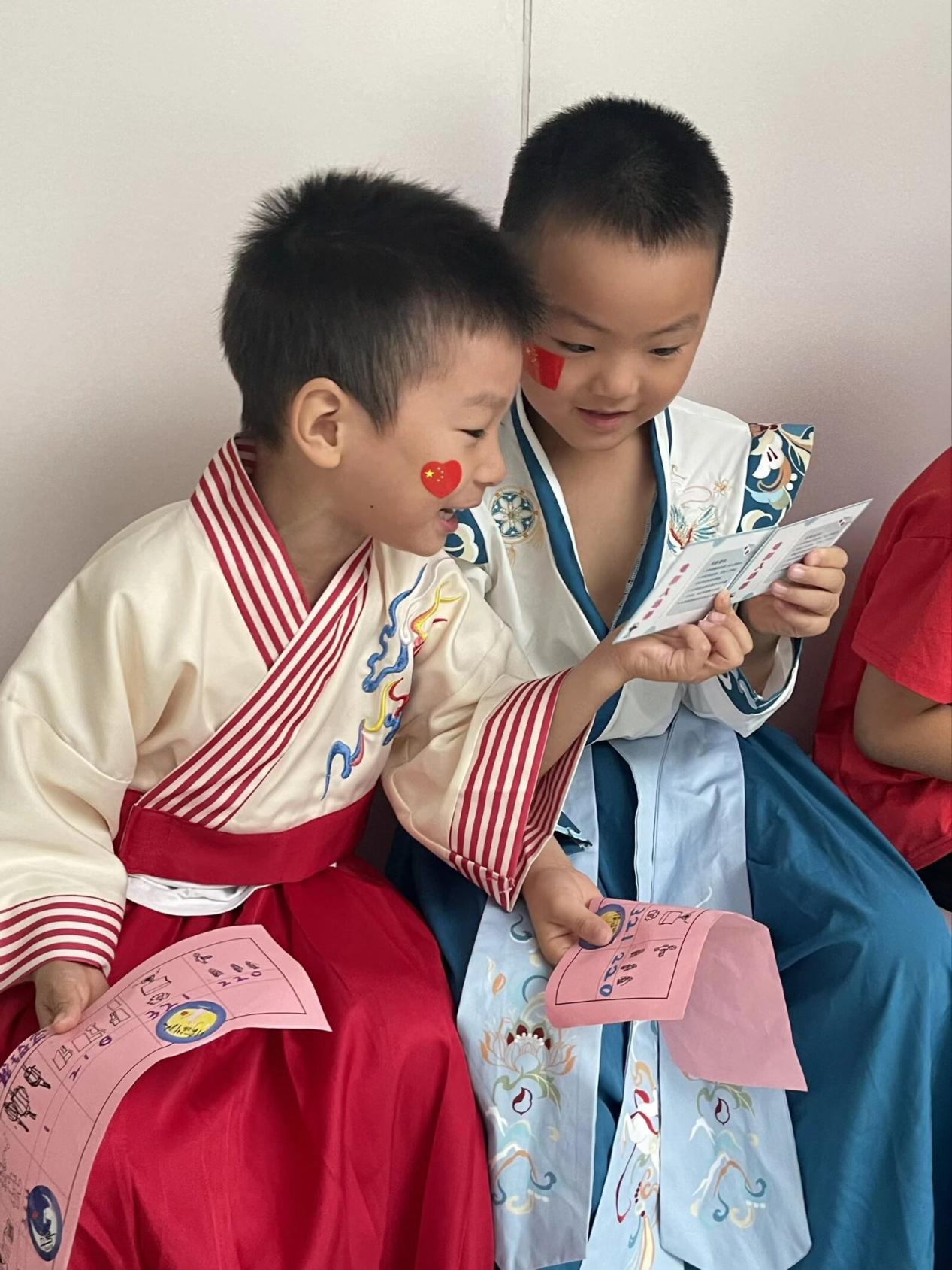活动以游园为核心形式,按幼儿年龄段精心设计差异化内容。大班的幼儿自制游园卡进行自助选择区域游玩;中班幼儿在老师的带领下打卡,共设六大分散活动区域分别是:门厅与1楼走廊的“本土中秋灯谜会+剪纸”,让幼儿在猜谜与裁剪间感受文字与手工的乐趣;小社会空间的“共‘画’庆祝”吹塑版画活动,鼓励幼儿用画笔描绘心中的中秋;建构室的中秋观影、绘本馆的“爷爷奶奶讲故事”、科常室的本土童谣传唱,以及三楼多功能厅的“diy特色月饼+拍照”,从视觉、听觉、味觉多维度激活幼儿的文化感知。