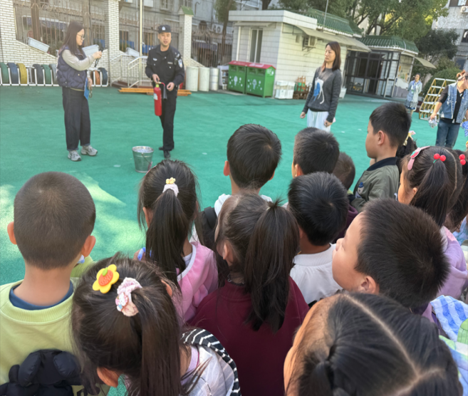 何赟警官现场开展消防知识互动问答,演示灭火器操作并讲解用途,让幼儿从“会逃生”延伸到“懂消防”,让安全教育更生动落地。