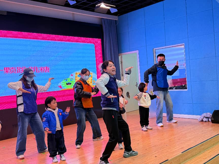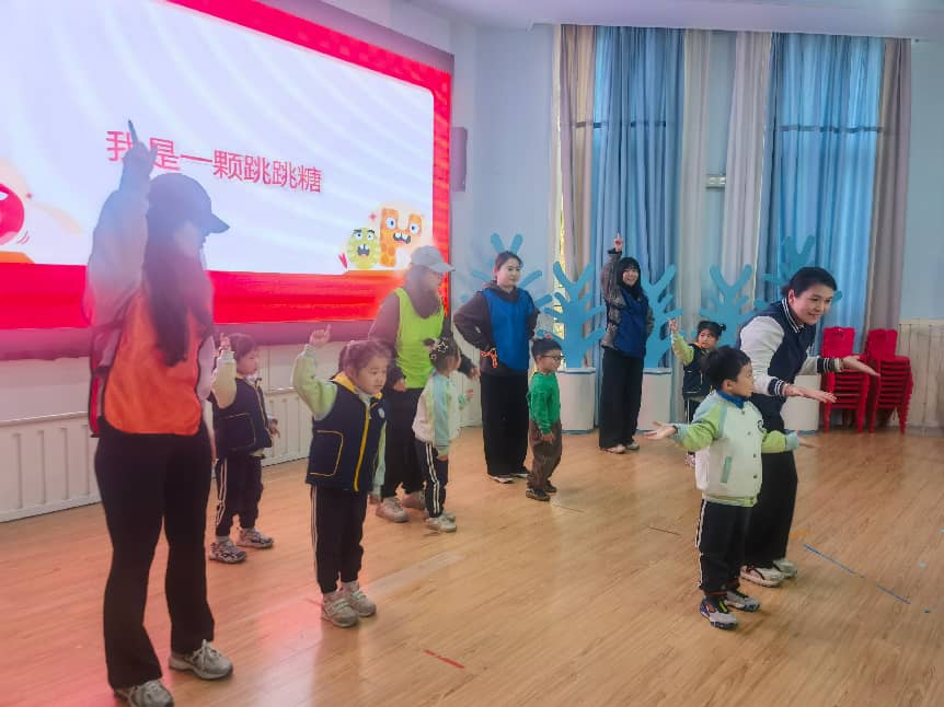 活动正式拉开帷幕。主持人首先通过精彩的视频展示了幼儿园的运动特色,随后邀请家长分享亲子运动前的准备经验,并强调了热身运动的重要性。在老师的带领下,家长与孩子们共同跳起热身操《一颗跳跳糖》,现场氛围瞬间热烈起来。