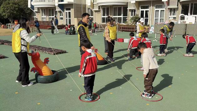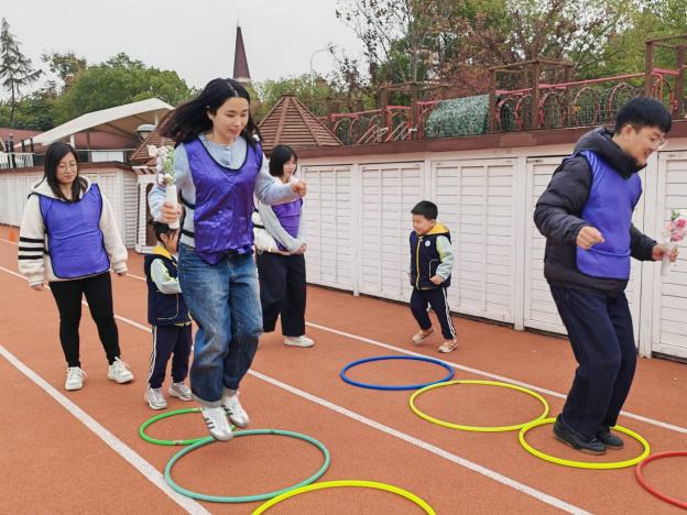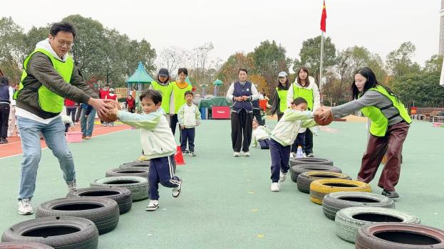 大班“星球大战”里家长与孩子互掷沙包欢乐躲闪,“垫子大冒险”中亲子协作完成攀爬翻滚,“一圈到底”考验着默契的肢体配合……每个游戏场地都洋溢着欢声笑语,孩子们在家长的陪伴下,既锻炼了平衡、协调、力量等运动技能,也在互动中拉近了亲子距离。