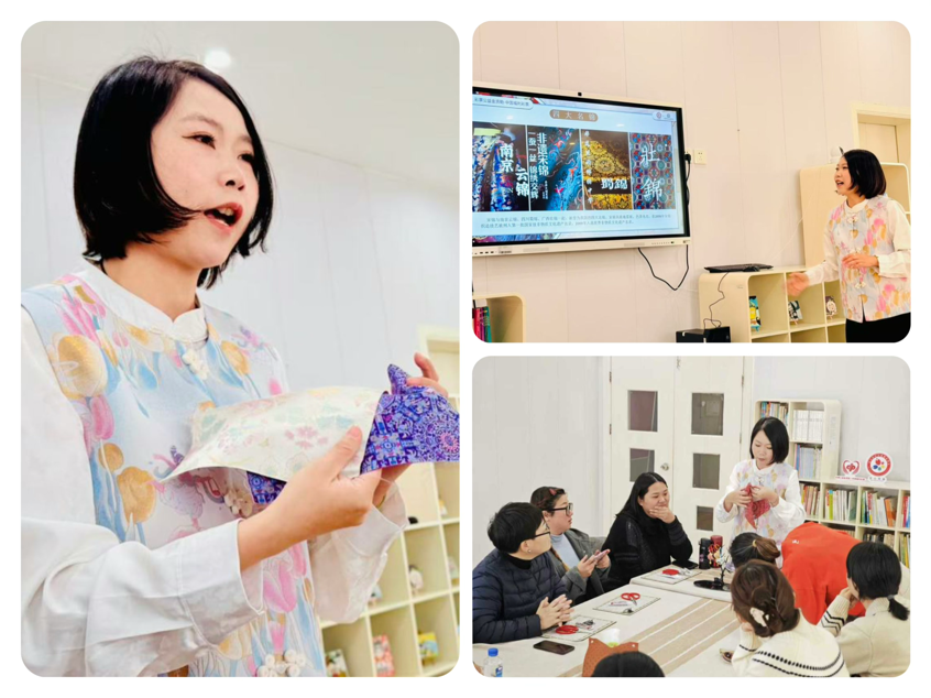 本次活动,幼儿园特别邀请宝山区婚姻家庭辅导服务项目专业讲师,为老师们带来一场生动的非遗科普课堂。讲师围绕“四大名锦”的历史渊源、宋锦千年织造技艺的传承脉络,结合图文素材细致讲解,从面料纹样的寓意到织造工艺的匠心,全方位解锁宋锦的文化密码。老师们认真聆听、积极互动,沉浸式领略中华传统工艺的深厚底蕴与独特韵味。